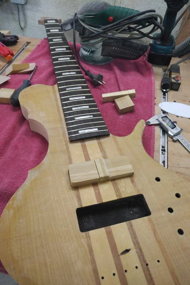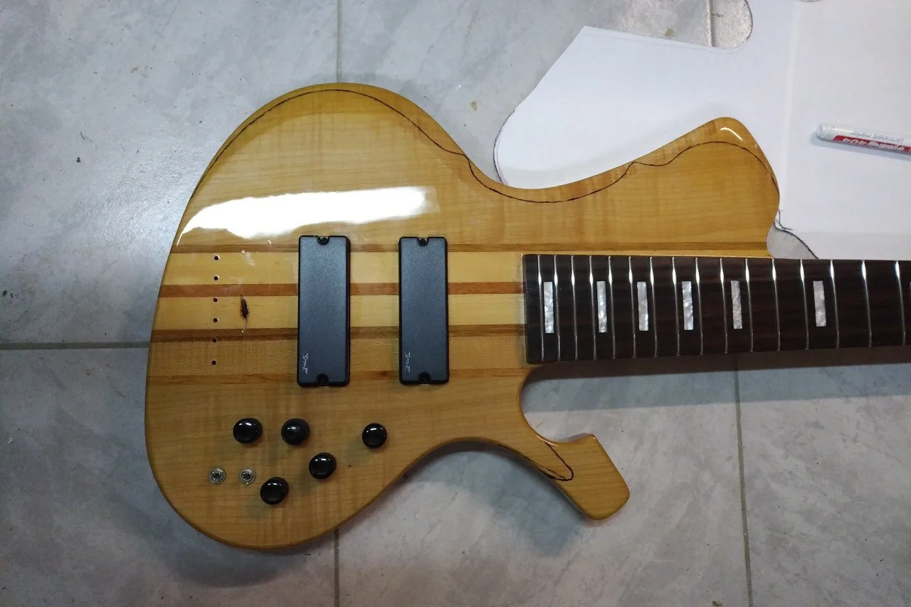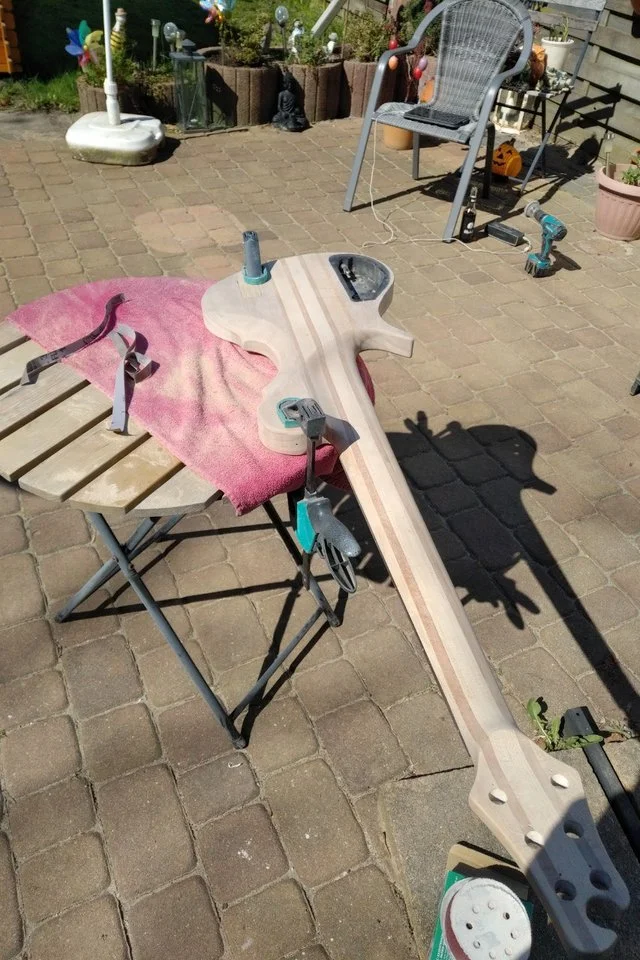 Ich nenne es die „Spear S2 Transformation“. Also ich hatte Lust auf nen 6-Saiter und steh auf das Singlecut-Design. Im Netz fand ich die Marke Spear, die günstige (billige?) Bässe und Gitarren anbieten. Im Internet sah er ganz gut aus, in Wirklichkeit dann nicht so... Ich musste mich entscheiden, ob ich ihn nun zurücksende und weitersuche nach „meinem“ 6-Saiter, mir war aber auch klar, dass ich dann wohl am Ende beim 2- bis 4-fachen des jetzt gezahlten Preises lande. Bespielbarkeit war zudem gar nicht schlecht... Und wenn ich da etwas Zeit und Arbeit reinstecke, dachte ich mir, wird es umso mehr „mein“ Bass, zu dem ich mich eher verbunden fühle, als zu irgendeinem gebraucht gekauften 2000€-Boutique-Bass (leider schon mal genau so erlebt). Und da lief auch schon die Bandsäge...