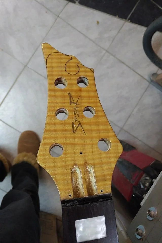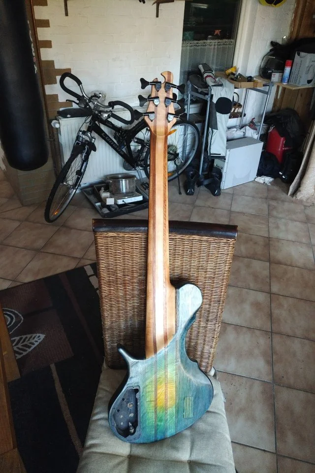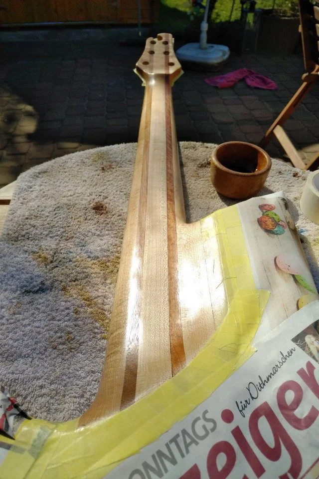 Der Neck hat eine Behandlung mit Walnussöl bekommen und wurde zu einem späteren Zeitpunkt mit Wachs von Rockinger gefinisht.