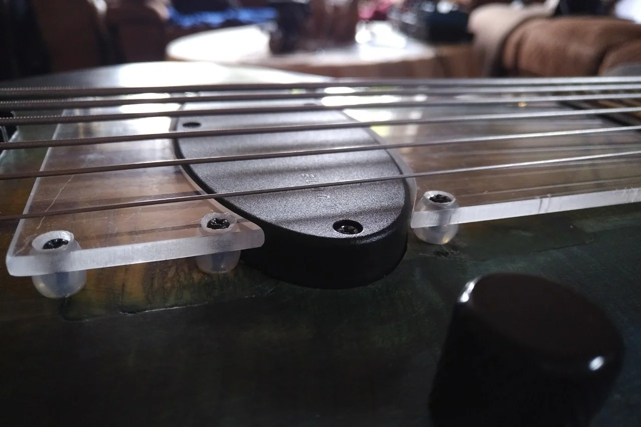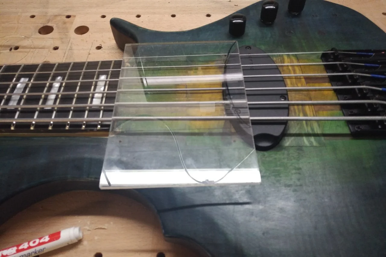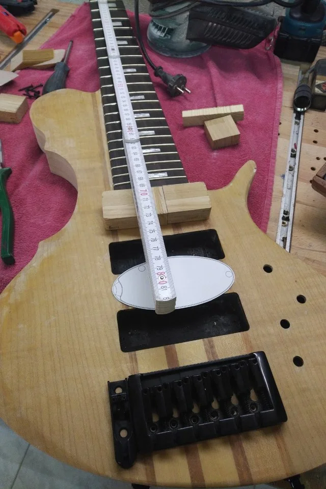 Für mich war klar, dass die Elektronik in dem Zug komplett getauscht wird. Es waren zwei Spear-eigene Soapbars verbaut mit einer 3-Band-Aktivelektronik mit Aktiv-/Passiv-Switch und Mute-Switch. Ich wollte einen einzelnen Pickup, einen Delano Xtender, passiv mit Coil-Switch und Tone-Poti, mehr nicht. Also alte Pickup-Fräsungen füllen und neue Position des Delanos festlegen. Ich hab hierfür den Abstand von Sattel zu Pickup von meinem Stingray gemessen und hier verwendet.