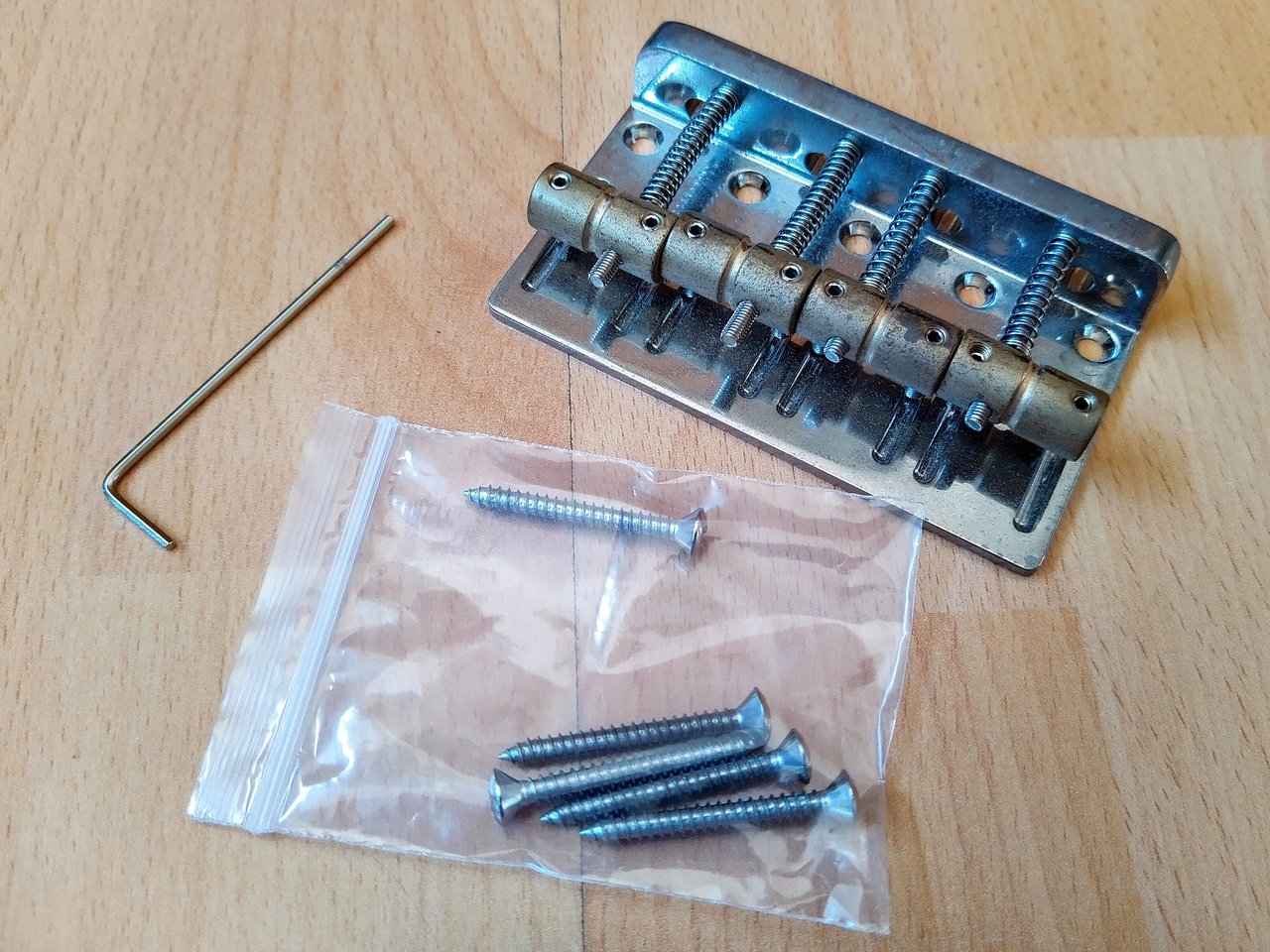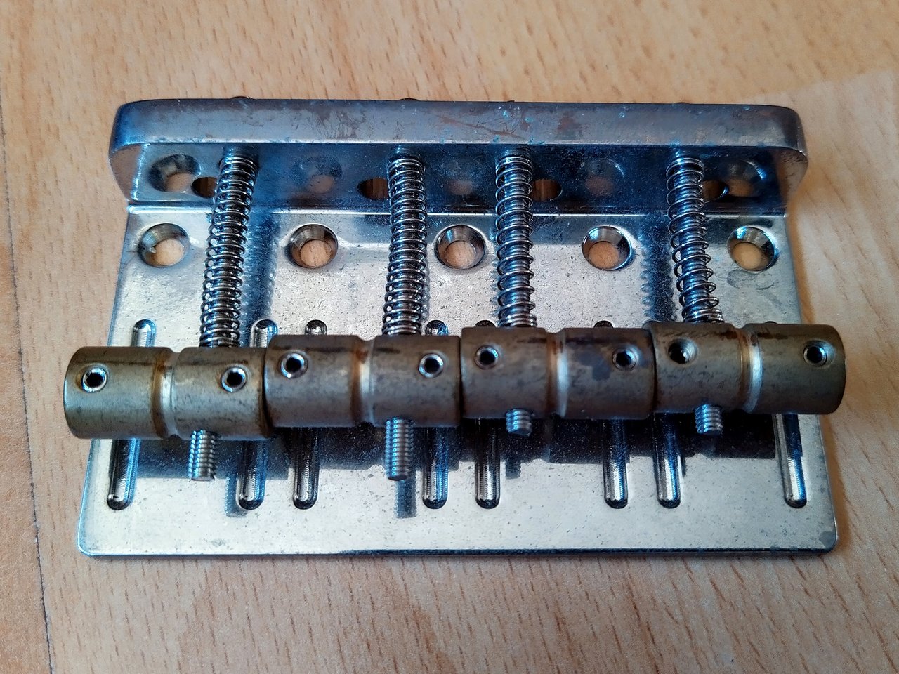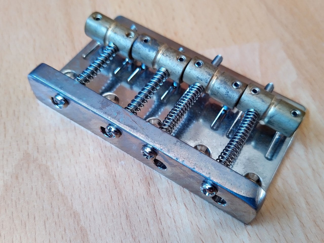 Zum Verkauf steht eine HiMass Bridge mit Messing Reitern. Sie stammt von einem Squier Classic Vibe 60ties Jazz Bass.