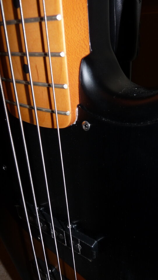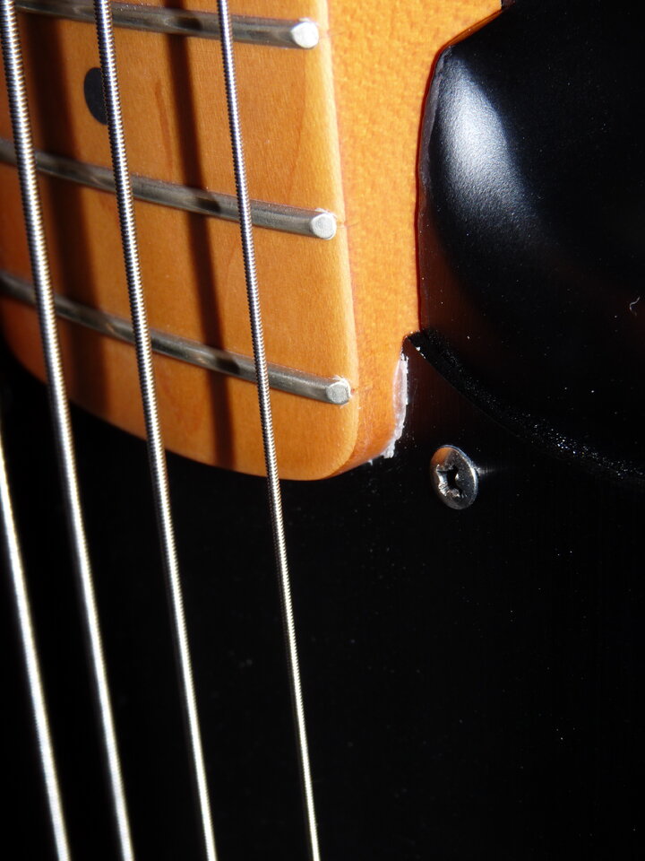 Das einige, was ich komisch finde ist beim Übergang vom Hals zum Pickguard so ein weisser Füller (Klebestoff?) zu sehen.