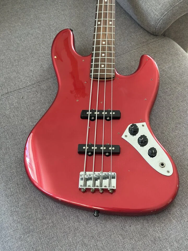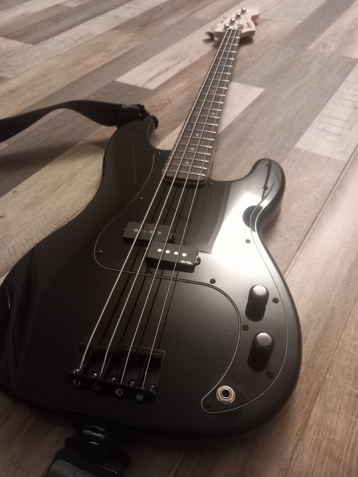 Ich bin total überrascht von dem Gerät. Der ist toll verarbeitet, hat einen schönen Jazz Bass Hals, der sich super anfühlt. Keine scharfen Bundenden. 3,75 Kg. Nur das schäbige, schlecht gearbeitete, 1-lagige weiße Pickguard lies den Bass sehr billig aussehen.