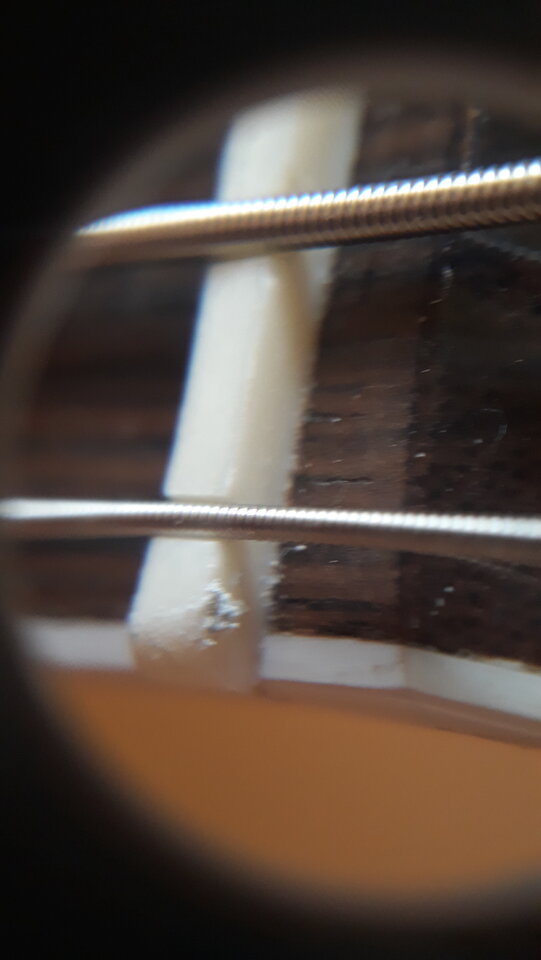 Beim wechseln der Saiten bemerke ich grobe Plastikspäne am Sattel.