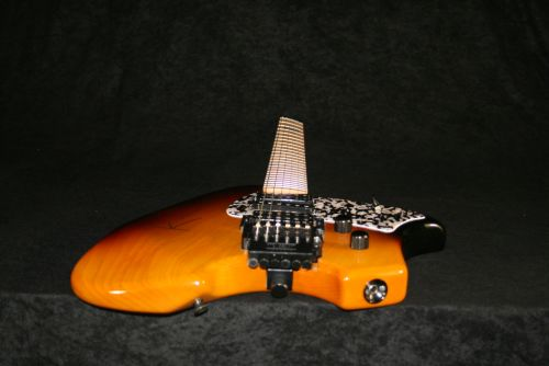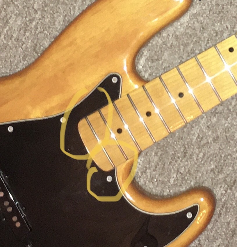 Gestern habe ich dann eher zufällig nochmal an der Kopfplatte Richtung Korpus geschaut und einen Twist bemerkt. Ich dachte erst, es sei eine optische Täuschung. Es sah auch so aus, als wäre der Hals-Korpus-Übergang nicht ganz gerade.