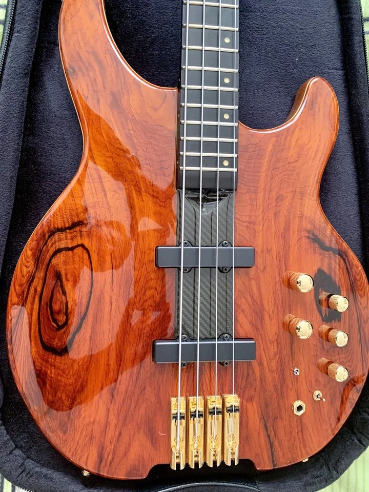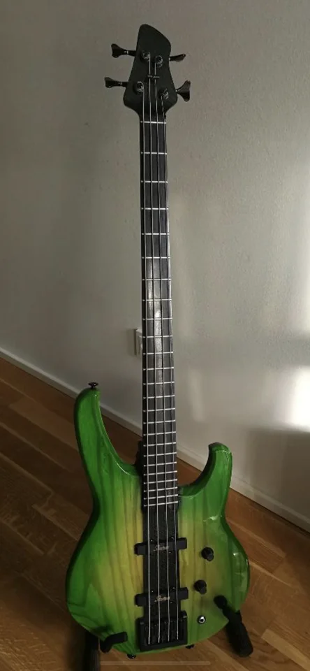 For amplification he uses a Markbass F1 amp with 2 4x10 horn loaded cabinets, with a repeater amp on the other side of the stage through a regular Marshall 4 x 12 cabinet.