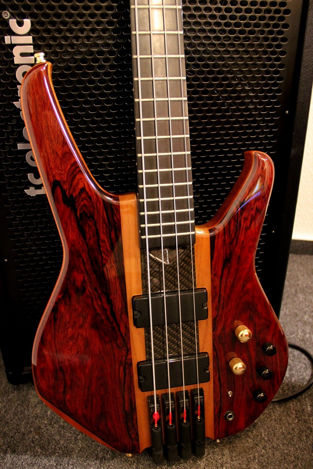 Als der Bass dann endlich ankam, wurde ich nicht enttäuscht. Im Gegenteil – meine Erwartungen wurden in jeder Hinsicht übertroffen. Als ich den Koffer das erste Mal geöffnet habe, kam ich sofort ins Sabbern. Das Holz ist wunderschön und ähnelt stark dem klassischen Alembic Cocobolo. Da traut man sich gar nicht, das Teil anzufassen. Der Bass wies – wie versprochen – keine Macken auf (mint condition) und die Bespielbarkeit beim Trockenspielen war der Wahnsinn, aber dazu später mehr.