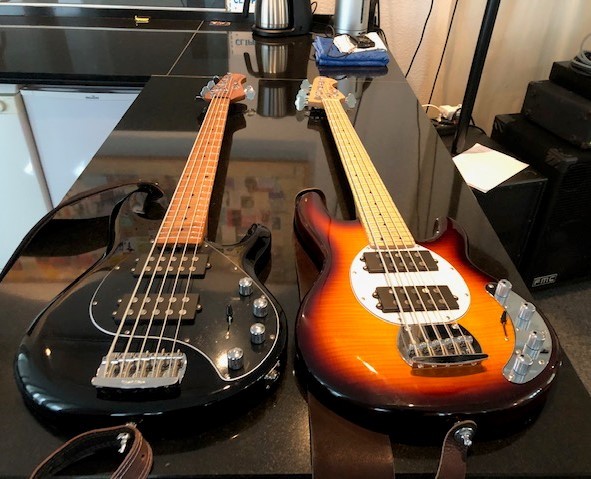Hier ein Foto von beiden (Schwarz Music Man Stingray Special 5 HH, rechts der Harley Benton, 199€):