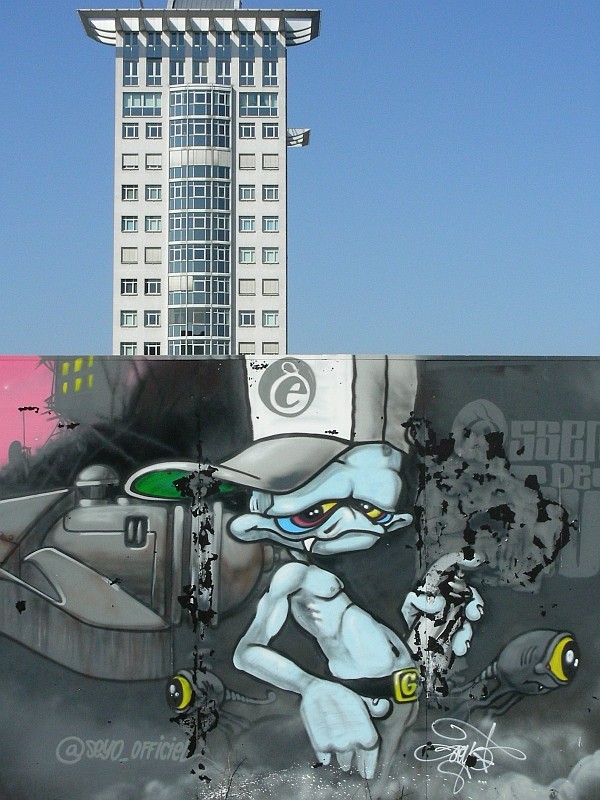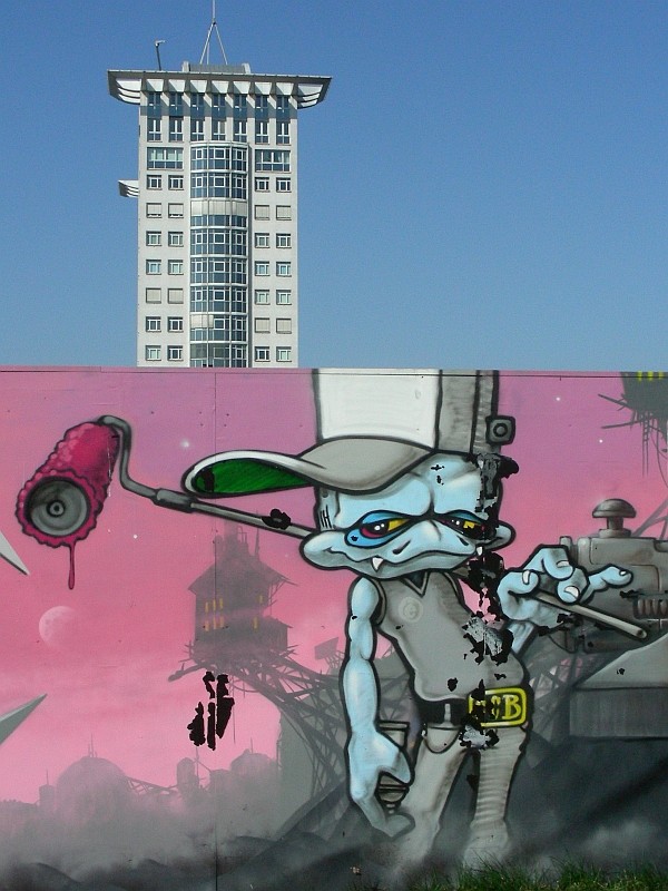 ich find die Graffits mit dem Hochhaus hintendran sehr gut100 x 100 Meter in Bärlin . . .