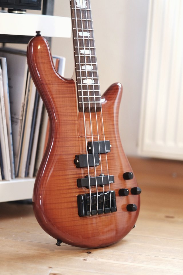 Dann endlich zuhause angekommen, Paket gechecked (kurz Puls gekriegt weil die Verpackung schon recht optimistisch war) und angefangen auszupacken. Dem Bob geht es soweit gut, am Hals gibt es eine Kerbe, keine Ahnung ob die vorher schon da war. Schnell ein wenig Liebe für das Griffbrett und Saiten aufgezogen. Das erste anspielen, wow ungewohnt. Hatte bisher nur Jazz, Preci und Stingray (ach ja und atk) gespielt und da ist es beim ersten greifen schon ungewohnt mit den 24 Bünden und dem flachen Griffbrett. Die Saitenlage natürlich hammer, der Hals super zu spielen aber nicht zu schmal, der Korpus schmiegt sich an meinen Front Ranzen an...geil. Unverstärkt bissl gespielt bis ich die kleine aus dem Wohnzimmer verkrault hab und dann schnell mal an den GK 700 RB II. Ooookey...kann man so machen! Dann mal noch in den Alphabass gestöpselt...joa, geht richtig gut! Knallt, dengelt, growlt...kann schon mal echt viel. Und er hängt trotz seiner leichten 3,75 kg ohne Kopflastigkeit kurz über der Kniekehle (den Gurt muss ich wegen dem versetzten Pin wohl noch biss anpassen).