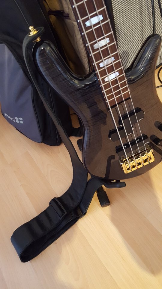 Ich hatte bisher erst 2 mal ganz kurz einen Spector in der Hand und war dementsprechend aufgeregt. Erster Eindruck: das finish gefällt mir super! Ist eher schwarz-gräulich und bekommt im Licht einen leichten grünstich. Da gibts von meiner Seite nix zu meckern. Der Hals gefällt mir ausgesprochen gut, genau richtig (41, irgendwas mm Sattelbreite und schön Fleisch, aber noch sehr gut bespielbar). Mitgeliefert wurden ein paar Schaller Security Looks in Gold (passend zur Hardware...die ich übrigens garnicht mehr schlimm finde wie einst), was ich auch ne gute Sache finde. Habe sie promt an einem fetten Levis Ledergurt installiert. Mit diesem hängt der Bass mir super am Körper...total komfortabel, kopflastig finde ich den Bass kaum (mag auch etwas am Gurt liegen).