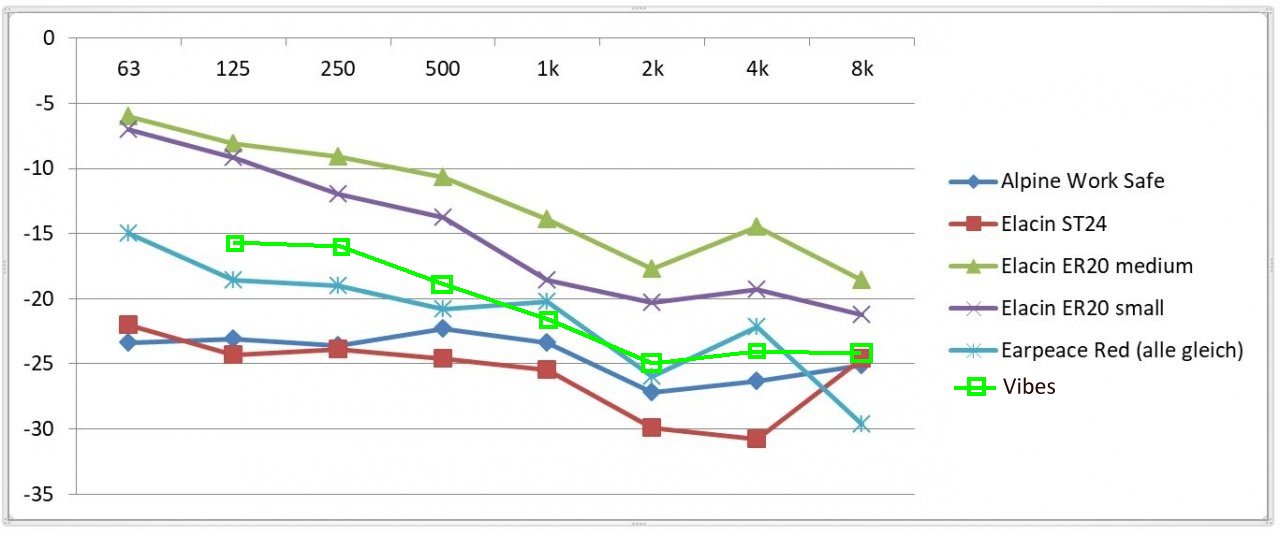 Dennoch sind die Vibes sicher ein guter Gehörschutz - die Charakteristik ähnelt sehr den Elacin ER20 small (mit etwa 4-5dB stärkerer Dämpfung). Und das zu deutlich günstigerem Preis. Die Alpine Worksafe hatte ich weiter oben empfohlen, weil sie bis in den tiefen Frequenzbereich ausgewogener bleiben - und weil sie für einen Spottpreis zu haben sind.