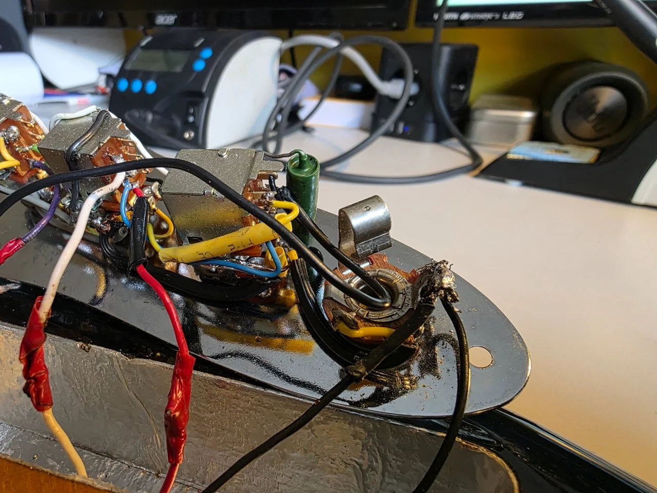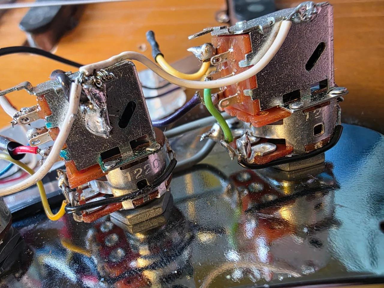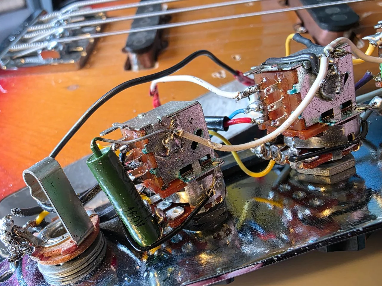 ich habe mich gestern schon mit Cadfael ausgetauscht, er konnte mir allerdings nicht helfen, da er diese Schaltung nicht kennt. Daher meine Frage jetzt an alle: In zwei meiner Jazz Bässe habe ich jeweils eine Schaltung verbaut, die meines Wissens nach in den 70er Jahren in den USA als Tuning Part von der Firma Schecter Guitar Research unter der Bezeichnung "Tapped Pickup Assemblies" verkauft wurden. Es handelt sich dabei um jeweils zwei Pickups, die mit je 2 voneinander getrennten Wicklungen versehen sind, welche mit 3 Push-Pull Potis gesteuert werden. Somit können deutlich unterschiedliche Lautstärken und Sounds geregelt werden. Da dies bei beiden Bässen sehr unterschiedliche Ergebnisse liefert und einzelne Potis gar keinen Effekt haben, würde ich die beiden Elektroniken gerne überarbeiten. Nur habe ich keine Ahnung, was da wie verlötet werden muss.