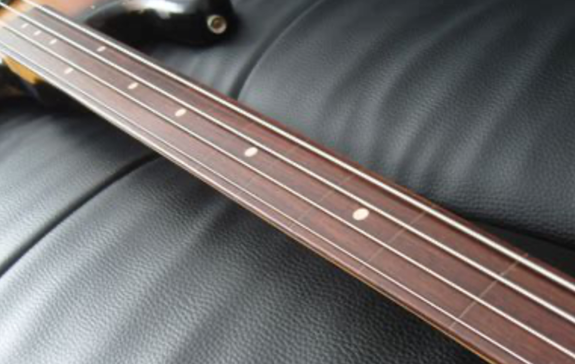 - Dezente oder keine „Fret-Linien“ auf dem Griffbrett, aber Pünktchen oben oder an an der Seite.