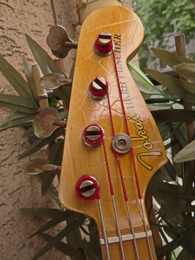Nach einigen Recherchen stellte sich der Hals als Tokai heraus, ich habe ein Reparaturdecal anfertigen lassen, das Griffbrett mit mehreren Schichten Polyutheran und Nitrolack lackiert. Ebenso die Kopfplatte.