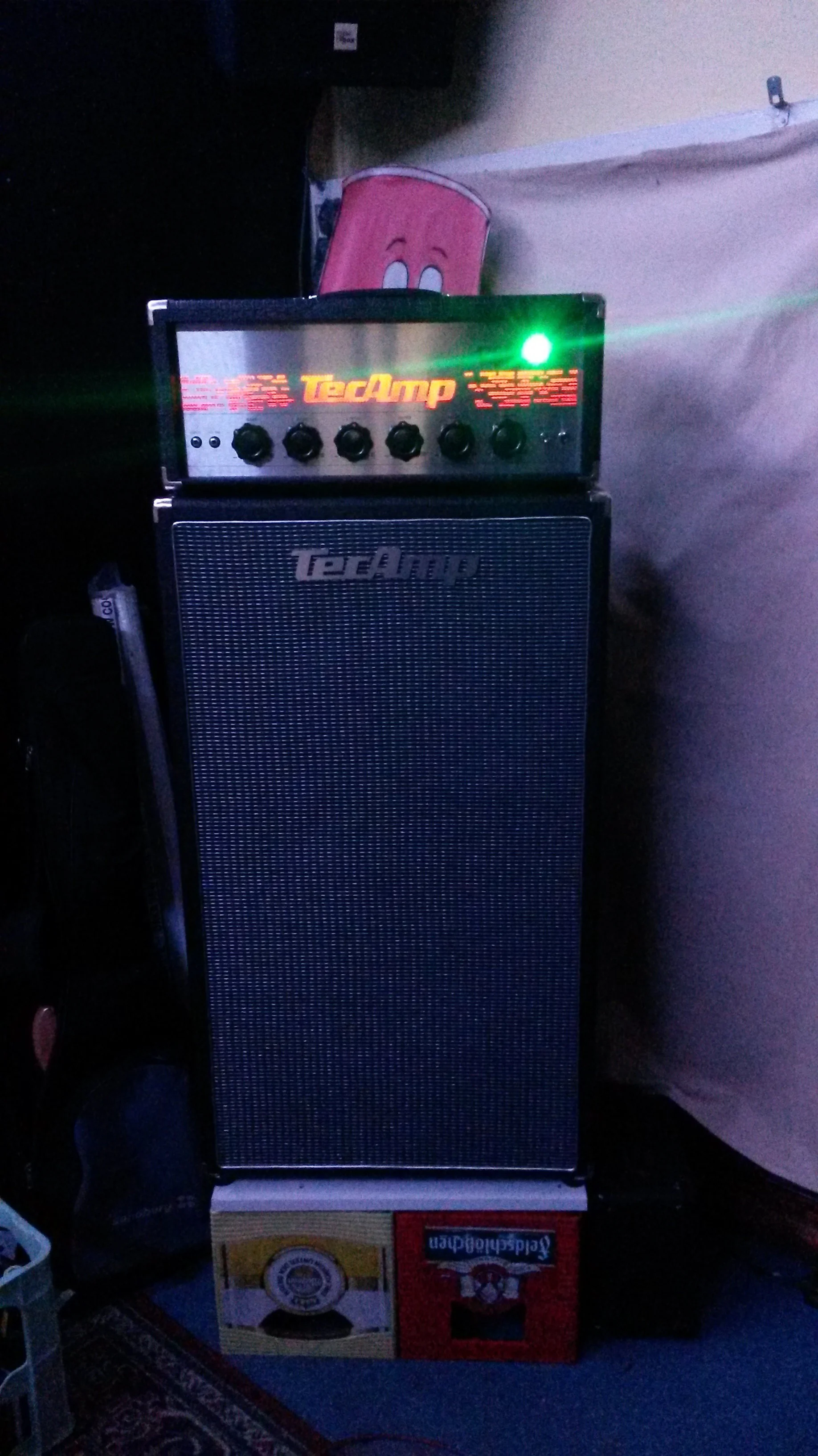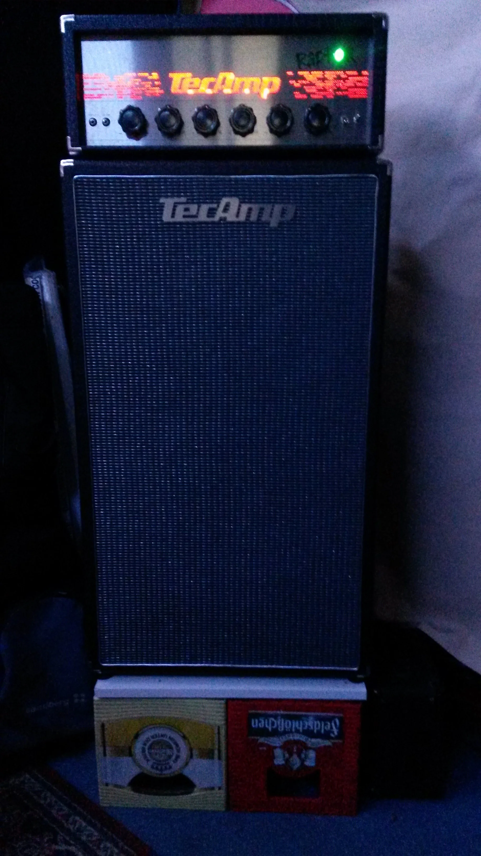 Der Verstärker ist ein 300W-Vollröhren-Amp, der klanglich echt ne Wucht ist. Hat Reserven ohne Ende; kann mir (bis auf vielleicht Stadiongigs) keine Situation vorstellen, in denen das Teil mal in die Knie geht. Meine Ohren machen auf jeden Fall vorher schlapp