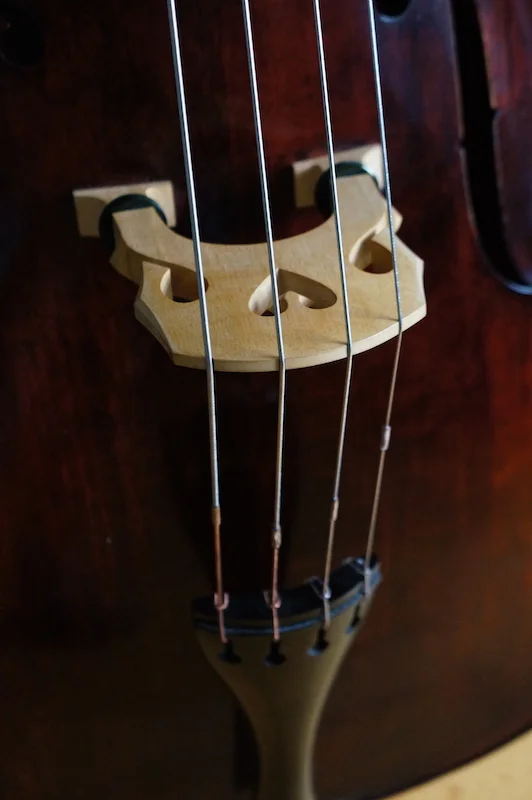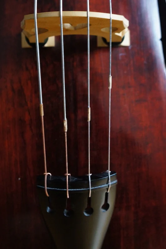 Wir haben die Saiten absichtlich "falsch herum" aufgezogen, um den Winkel nach dem Steg flacher zu halten...