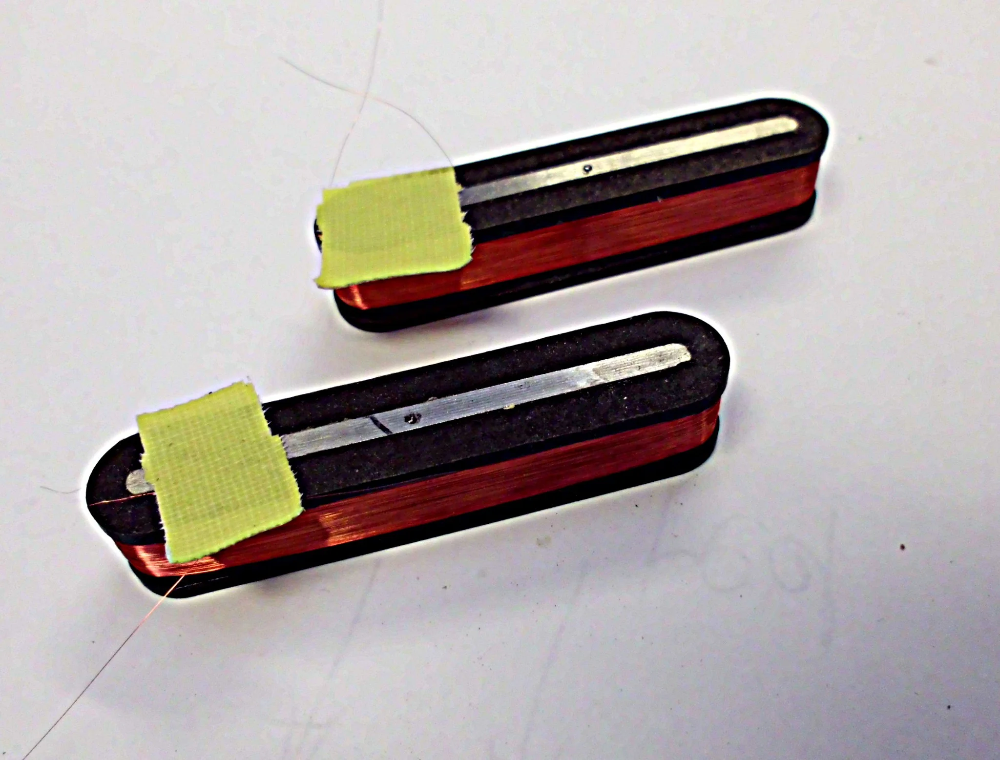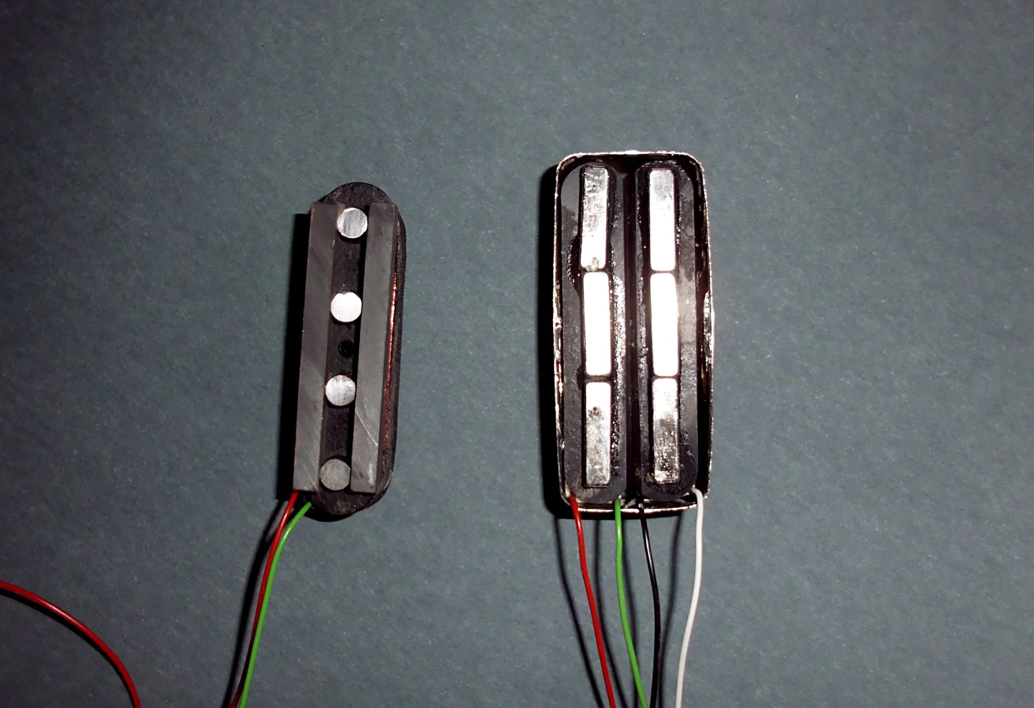 Ganz links die ursprünglichen Innereien des Minihumbuckers. Der stammt aus meinem Epi EB-3. Man sieht, dass die Polschrauben einfach ins Wachs gedreht worden waren, was, wenn ich es richtig in Erinnerung habe, beim alten EB-3 ebenfalls so gelöst worden sein soll.