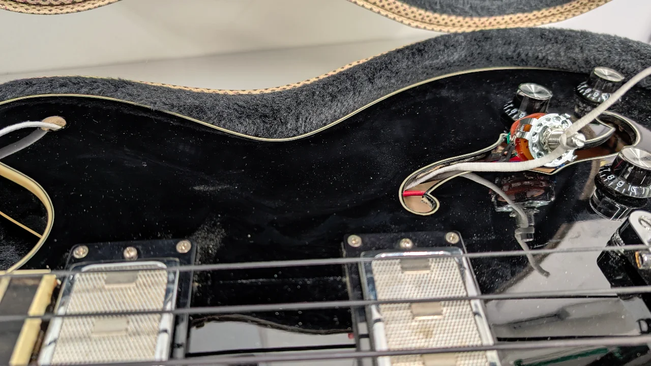 An meinem Exemplar hatte der Drehschalter für die Pickupwahl nicht mehr zuverlässig funktioniert, also habe ich mich zum ersten Mal an die Prozedur gewagt, an der Elektronik eines halbakustischen Instruments zu arbeiten und den Schalter zu ersetzen. Das heißt, das defekte Teil samt Kabeln erst ins Korpusinnere und dann durchs F-Loch nach draußen bugsieren, die Chose ab- und das Ersatzteil neu verlöten und dann der beste Part: den neuen Schalter wieder durchs F-Loch und das Korpusinnere zu seinem Befestigungsloch bugsieren, hoffen, dass er sich auf dem Weg dorthin nicht in den Kabeln verfängt, ihn dann irgendwie in aufrechte Position zu bringen, so dass er sich theoretisch in seine Bohrung stecken ließe, wenn man nur von unten gegendrücken könnte...