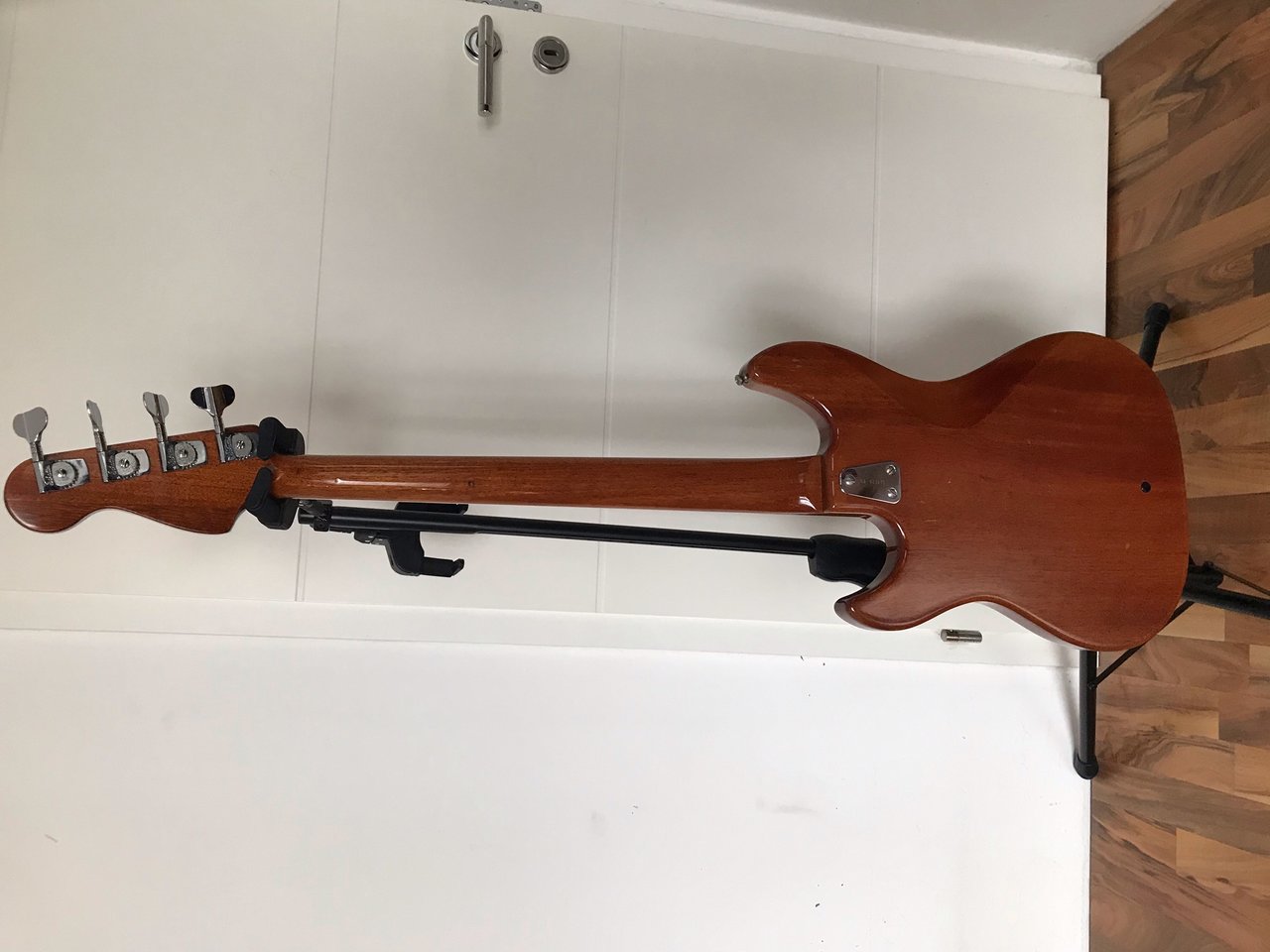 Das gesamte Holzkonstrukt (Body und Neck) besteht aus hochwertigen, einteiligen Mahagoni. Der Headstock ist „gewinkelt“ ausgeführt, damit die Saiten ausreichend Druck auf die Mechaniken erzeugen (daher keine Scheibe für die D+G Saite erforderlich). Die Pickups entsprechen technisch den JB´s, wurden aber ohne Kappen an den Pickguards bzw. Abdeckungen direkt mit Gewindeschrauben und Gegendruckfedern montiert.