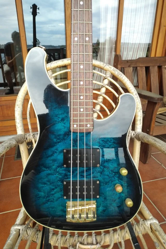 Hab neue, sehr gute Saiten von Smith draufgemacht, 40-100, und alles schön geputzt! Den Hals mit Zitronen-Öl behandelt. Der Bass klingt sehr gut, läßt sich gut bespielen. Alles ist sehr wertig, die ganze Verarbeitung! Die Brücke ist sehr interessant aufgebaut und hat ein einziges Manko, man muß die Saiten einhängen! Der einzige Minuspunkt an dem Bass...