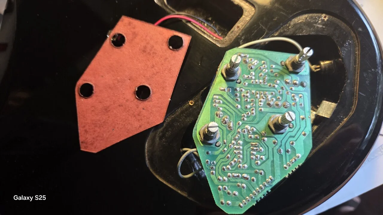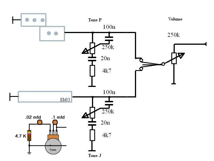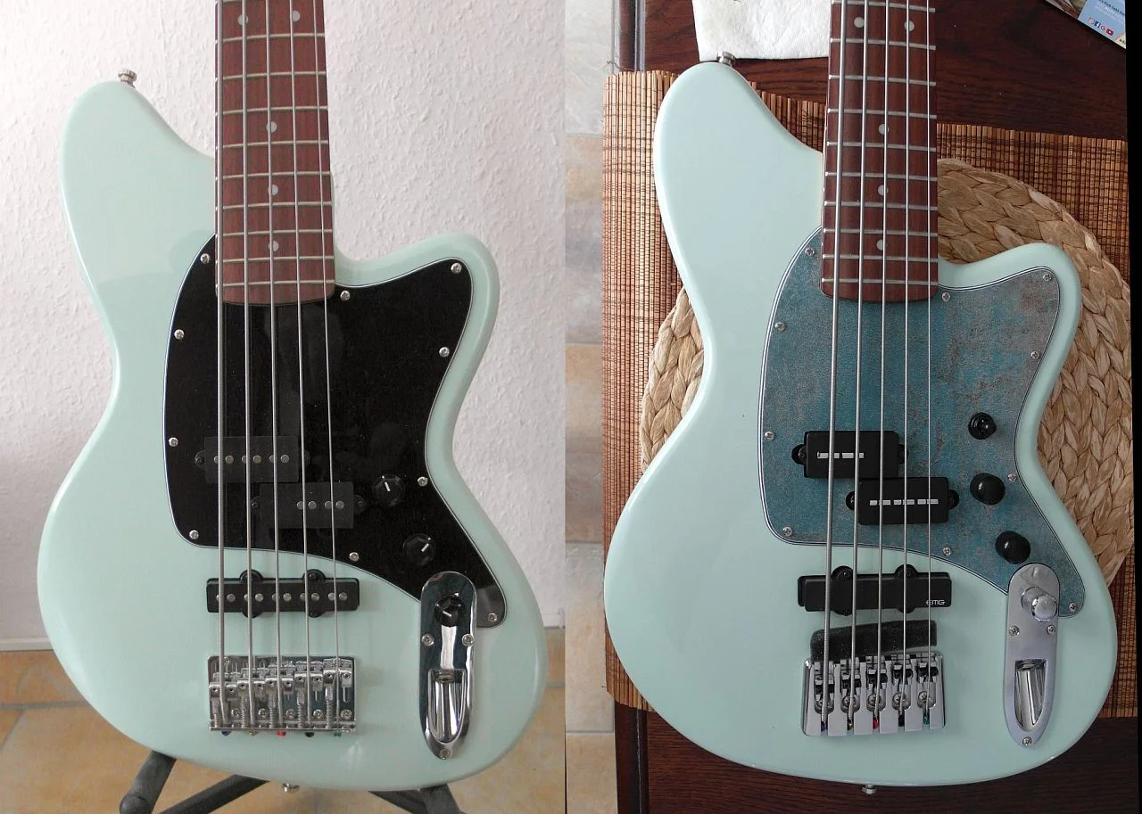Super merci, und wie klingt er zu Vorher?Ist ein 5er,also ein TMB35. So weit ich es noch erinnere, hab ich als erstes die Brücke gegen eine 3D-Brücke getauscht, weil ich das Griffbrett beim 5er in den oberen Bünden schon recht breit fand. Dann hab ich die Elektronik umgebaut, da ich anfangs dachte, ich könnte den mageren Klang damit verbessern. Ist eine Greasebucket-Schaltung reingekommen und ein Pickup-Umschalter, was die Sache aber nur bedingt verbessert hat. Deshalb hab ich dann zunächst den Steg-PU gegen einen EMG getauscht und später noch den Splitcoil gegen einen Blade von Nordstrand. Die Saiten hatte ich gleich anfangs schon gegen Halfrounds getauscht. Als mir das dann klanglich gefallen hat, mußte noch was fürs Auge ran, siehe Pickguard. Letzteres ist aber wie immer Geschmackssache. Obwohl... der Klang ja eigentlich auch.Schaltung und Pre/Post-pics anbei.