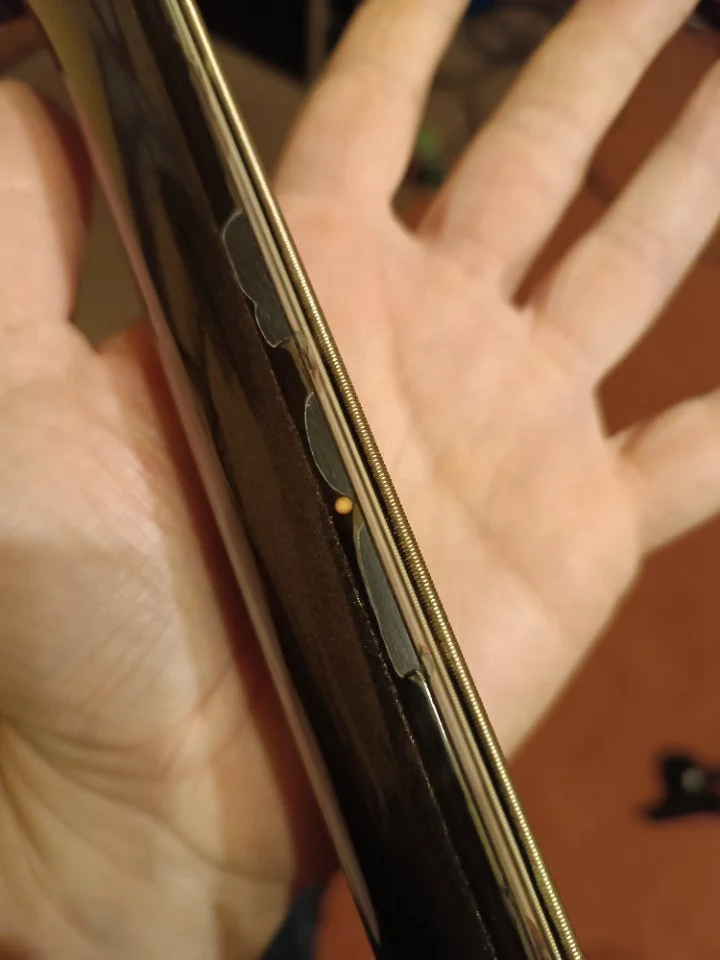 ich würde es machen. griffbrett gut abdecken. mit rasierklinge glätten, dann schleifen und polieren.Dropfilling mit Sekundekleber oder lieber nicht? Anhang anzeigen 982152