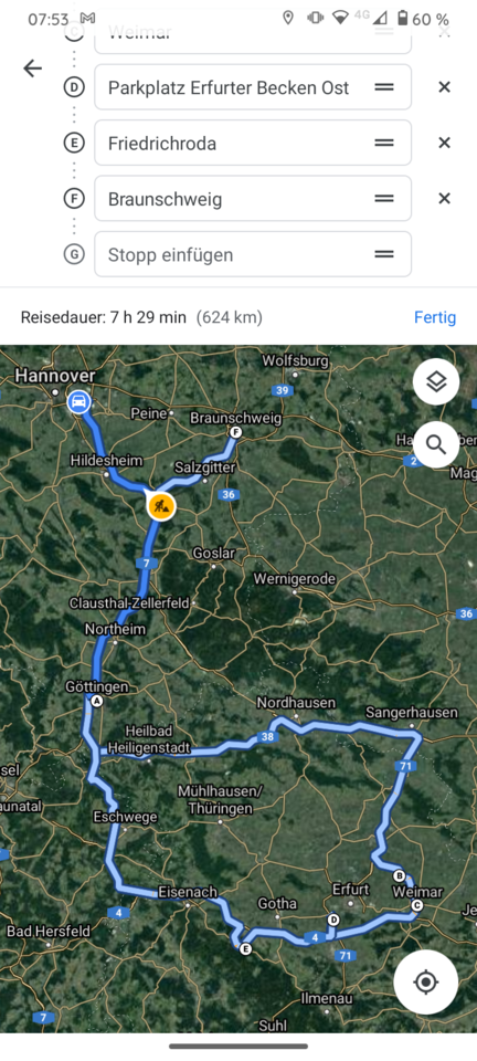 Erste Tour: Hannover - Göttingen - Berlstedt - Weimar - Bumsparkplatz Erfurter Becken - Friedrichroda - Braunschweig