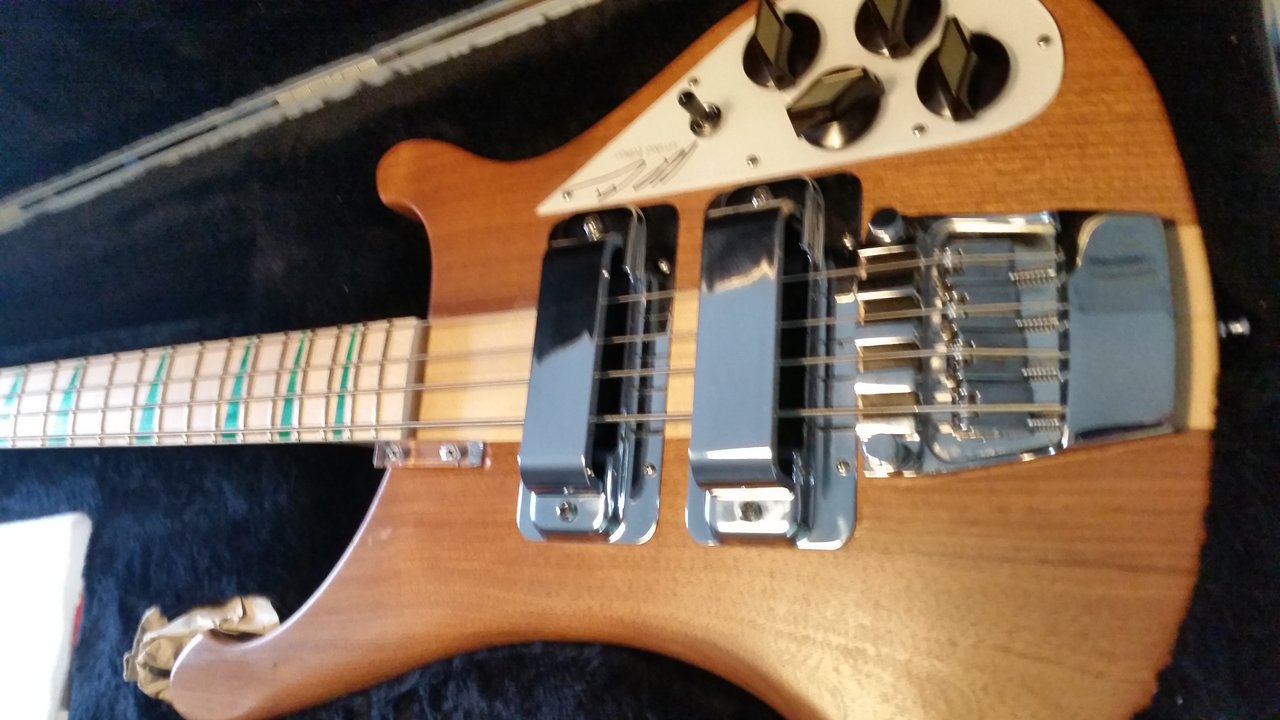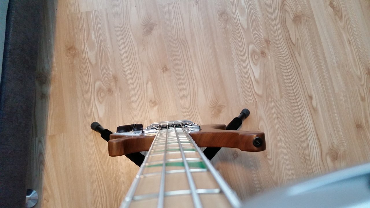 Bei diesem sehen die Saiten deutlich tiefer aus, bzw. steht der Hals nicht so weit über ...aber vielleicht kann der Kollege mal ein Bild von der Saite machen....oder gar messen ?Dafür ist jetzt ein Al Cisneros Rick drin: