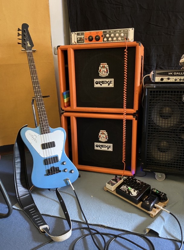 Runde 1a: pures Basssignal, alle EQs flat, Lautstärken angeglichen, die Gainstufe des TB nicht in der Zerre. Da nehmen sich beide Amps auf den ersten Hör nicht viel. Guter, cleaner Sound, typisch orange-gefärbt. Nach ein bisschen rumdödeln entscheidet sich mein Sohn für den 4 Stroke: „Der ist irgendwie besser. Voller und wummsiger.“