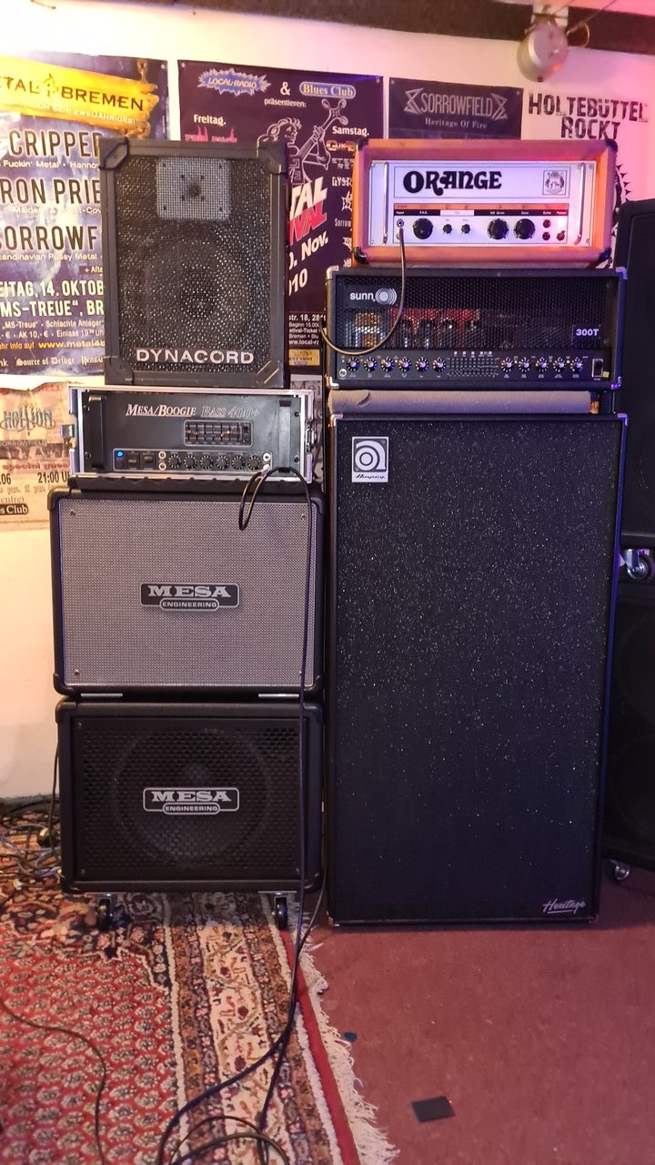 Sowas ähnliches hatte ich neulich im Praum ausprobiert. Mesa M6 an den beiden Doppelfuffzehnern für den cleanen Part und Ampeg SVT-3 mit Pedalboard an der 410CL…und Muffensausen habe ich nicht bekommen. Ich kriege nur dieses scheiß-grenzdebile Dauergrinsen nicht mehr aus‘m Gesicht…Aber wenn ich jetzt dran denke: drei fette Boxen mit drei Amps (Super Bassmann, AD MK II und MK III) nebeneinander und dann gleichzeitig auf E oder besser B Saite angeschlagen…da bekomme ich dann schon etwas Muffensausen.