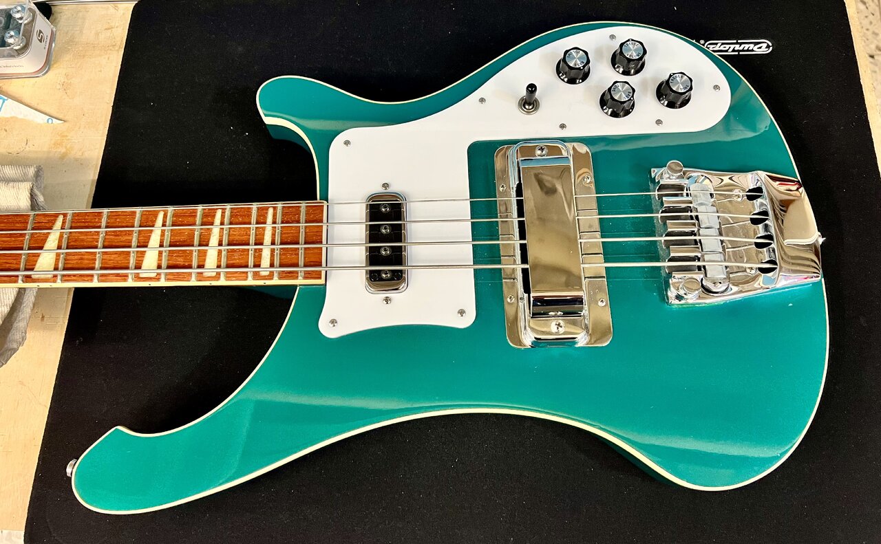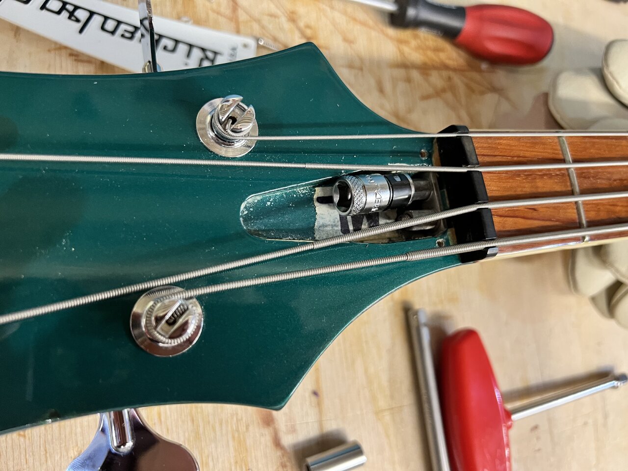 Hier sind Bilder von meinem Rick, Mittwoch angekommen, noch nicht gereinigt, und ich hab vorhin versucht, mal die beiden quarter inch nut driver, die ich habe, auf die Muttern der Spannstäbe zu stecken, sie haben zu große Außendurchmesser. Die Farbe von dem Teil ist einfach grandios, ich liebe das, das ist wie der Ozean in der Sonne.