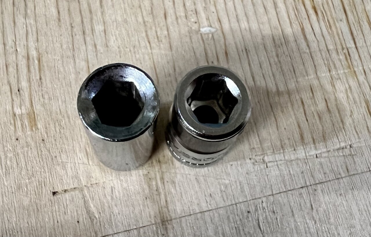 Die beiden Bithalter passen nicht, die haben Außendurchmesser von 11,6 mm und 12,1 mm. Man könnte die auf dem Schleifbock runterschleifen, aber der kleinere, günstigere ist aus irgendeinem Gußmaterial, nicht geschmiedet, dem traue ich nicht über den Weg. Der Gedore ist mir zu schade zum runterschleifen. Ich warte einfach, bis der richtige Schlüssel da ist.