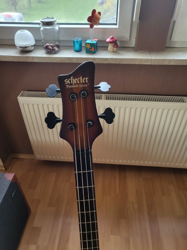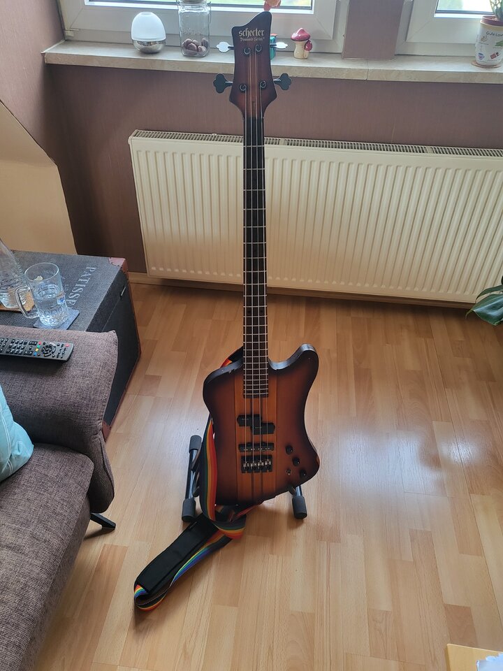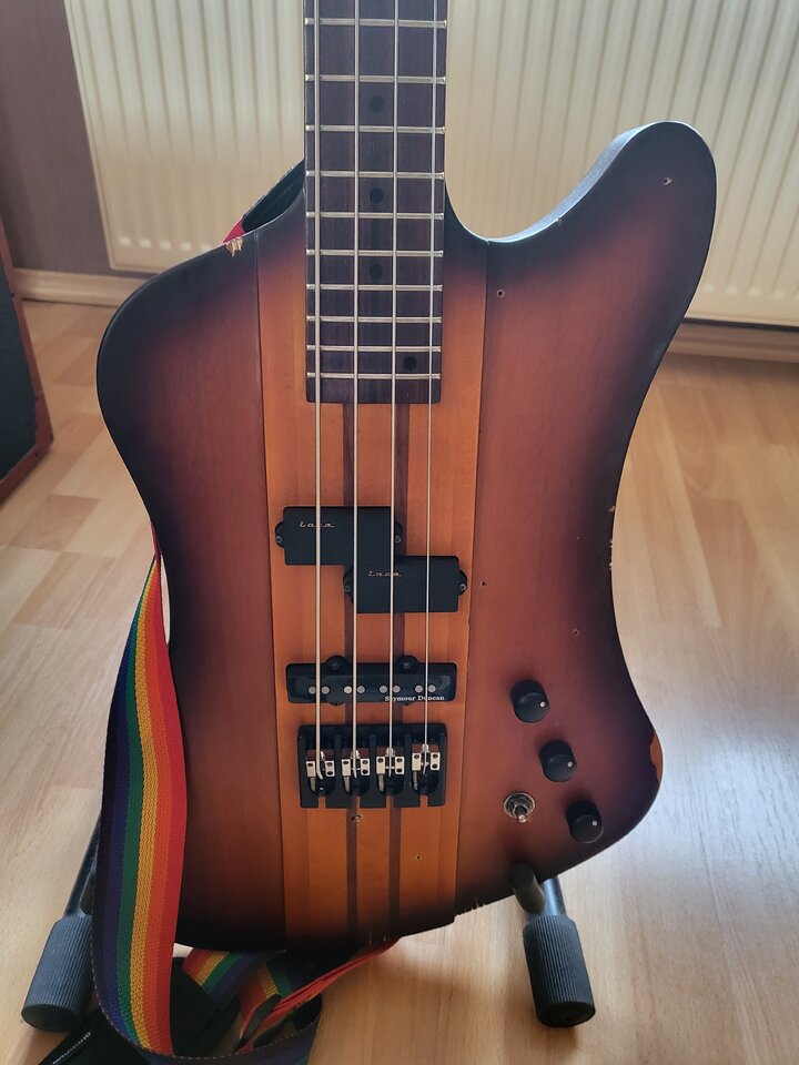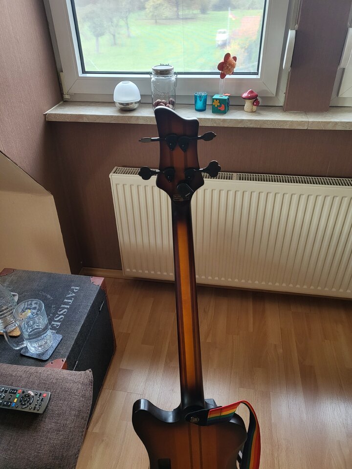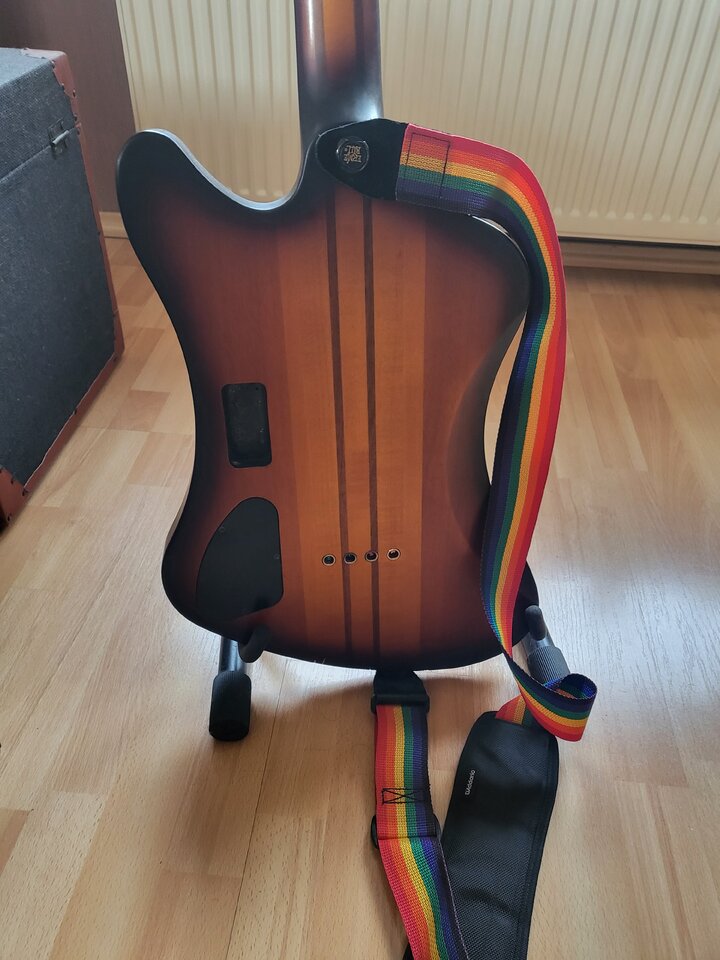 Basis ist ein Schecter Nikki Sixx in seltenem irgendwas-burst, vom Vorgänger "mattiert". Ahorn/Walnuss-Hals mit Palisander-Griffbrett in Preci-Maßen, und massive (35mm) Mahagoni-Flügel.Habe ihn auf Passive PUs von Lace und SD umgebaut, sowie Brücke, Potiknobs und Mechaniken gegen lightweight getauscht. Dadurch hat er für mich erträgliche 4,4kg.