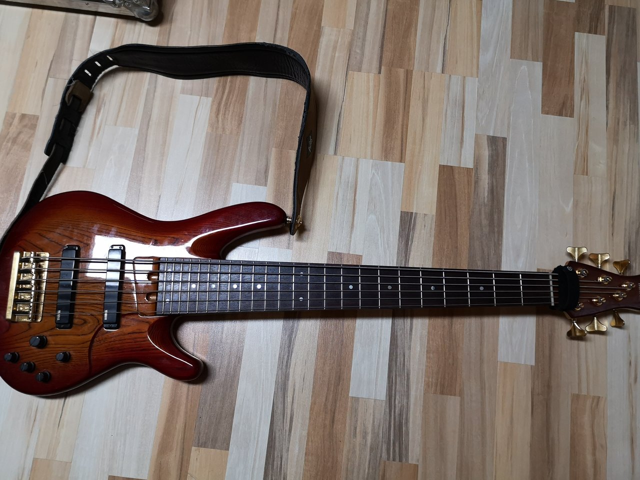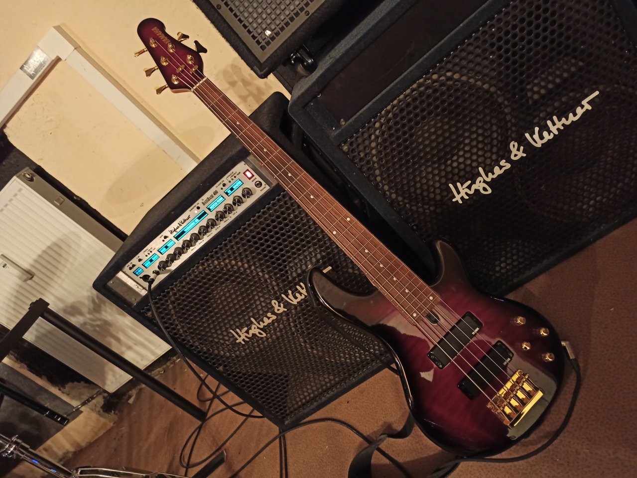 Der Bass ist absolut tadellos mit nur minimalsten sichtbaren Spielsuren auf dem PG. Der Vorbesitzer hat allerdings anstelle des 2. Vol Potis einen Balance Regler eingebaut, was meinen Vorlieben durchaus entgegen kommt. Da ist so ein doppelstöckiger Balance Poti verbaut. Ggf. hat das was damit zu tun, aber ich bemerke jedenfalls keinen Höhenverlust in Mittelstellung. Ebenso hat er den Saitenniederhalter durch einen etwas solideren ersetzt. Auch prima.