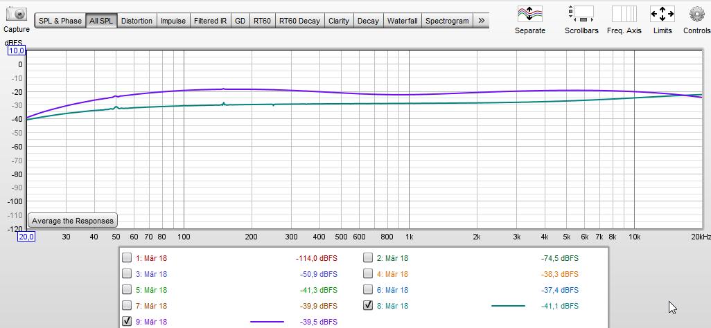 Neben Amplitudengang (die Summe aus allem) sind die Fundamental (1st Harmonic) und die Harmonischen von #2 bis #9 angegeben und der Gesamt THD.