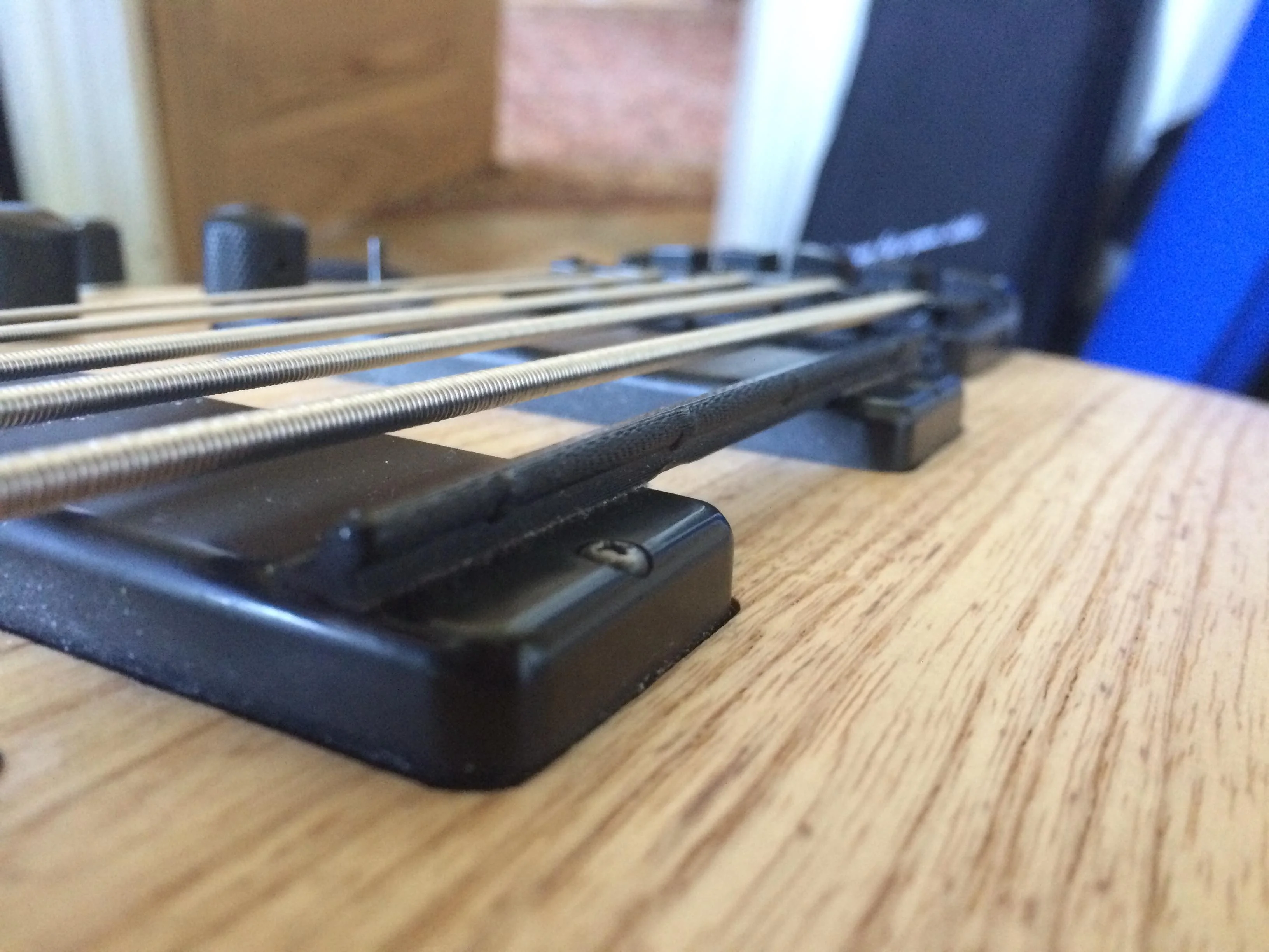 Also habe ich eine "sechste Saite" konstruiert, auf einem 3D-Drucker ausdrucken lassen und mit doppelseitigem Klebeband auf die Pickups geklebt. Fühlt sich super an und der Daumen kann endlich da liegen wo er hin will.