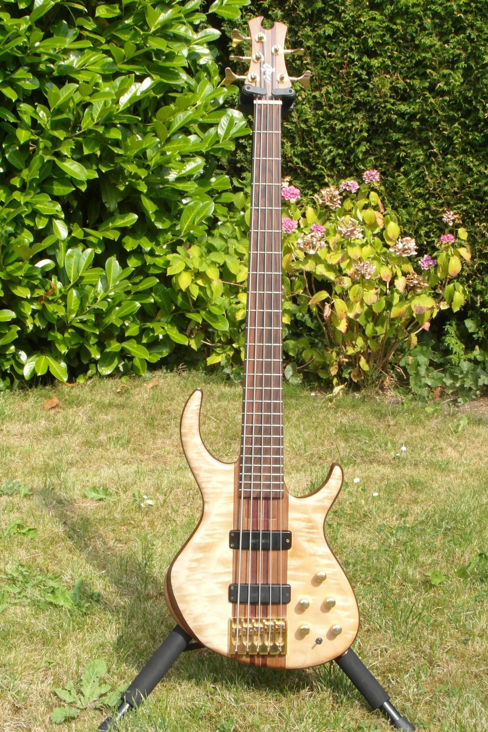 This beautifull Tobias classic is in topshape and sounds, plays and looks like a dream. Set up with elixir strings and with it's original case. The serialnumber is 10178. Topwood is flamed maple, 7 piece neck with purple heart stringers. 5 piece body. Set up with gold hardware. This bass has it all but it has to go. Located near Rotterdam-Holland Price: 1750 euro's + shipping.