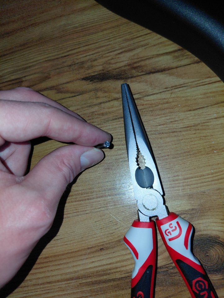 Funktioniert auch gut, wenn nur ein kleines Stück der abgebrochenen Schraube aus dem Holz schaut. Ist auf jeden Fall weniger Aufwand als final rausbohren.