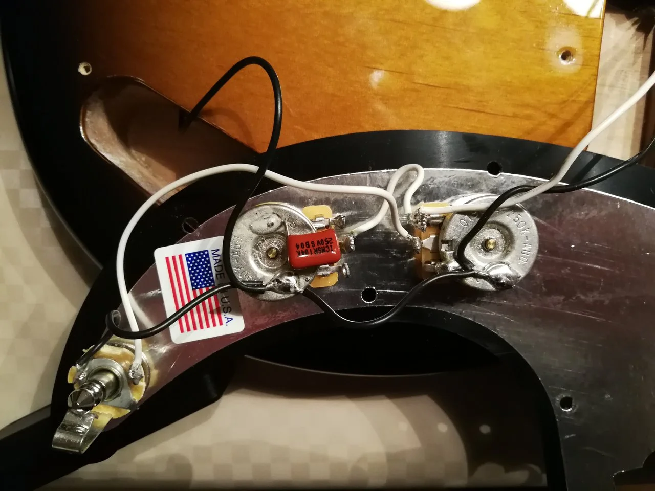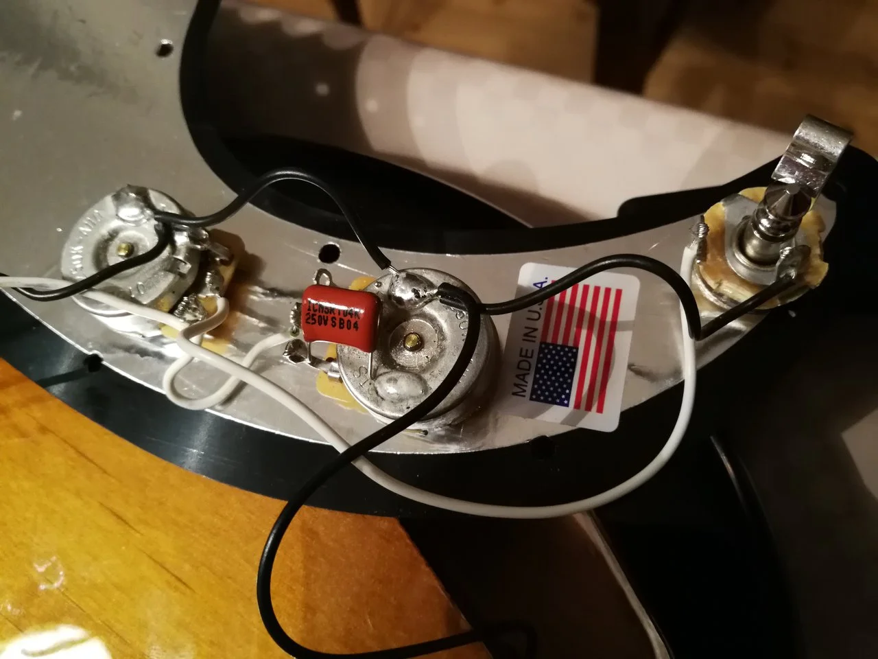 Habe u.a. bei meinem Classic 50's P das eloxierte Alu-PG durch eins aus Kunststoff ersetzt. Das neue PG hat auf der Unterseite Abschirmfolie drauf. Verdrahtung von PU's, Potis, Buchse... alles unverändert.