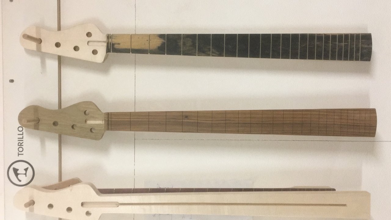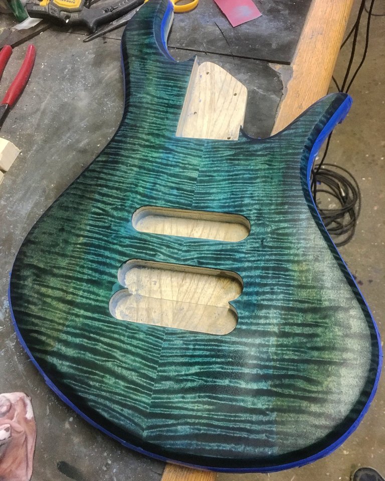 sehr fein!!!Ich hab neulich gebeizt... hier der noch abgeklebte Body (abgeklebt, weil nur das Top gebeizt wurde. Dazu gehört der oberste Hals im zweiten Bild (Bergahorn & Pale moon ebony-Griffbrett)