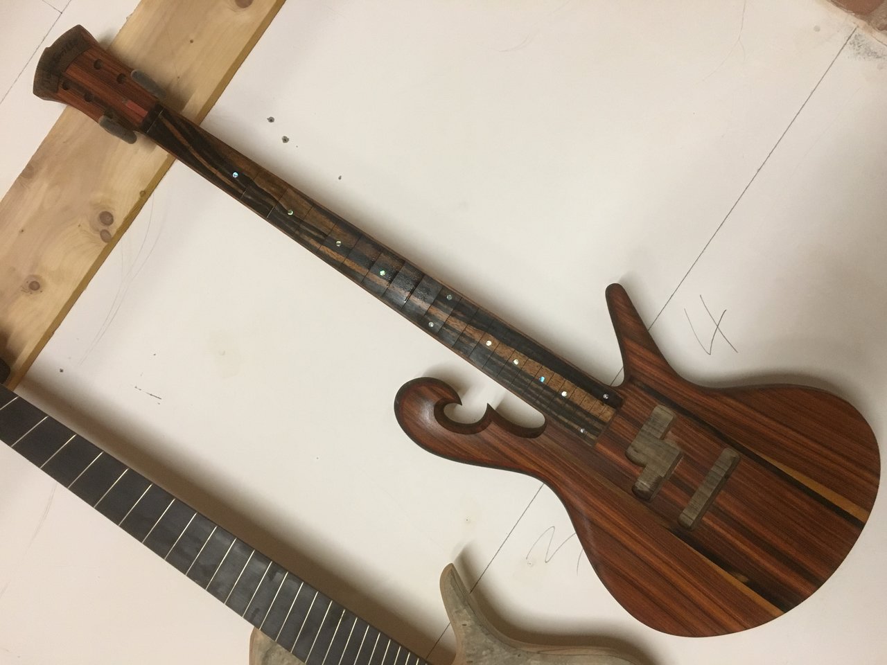 Aus welchem Material werden die Saitenreiter?Und hier die Ebenholzbrücke mit Schlangenholz-Zierstreifen. Die Brücke habe ich 3mm im Korpus versenkt und die Saiten gehen letztendlich durch den Body