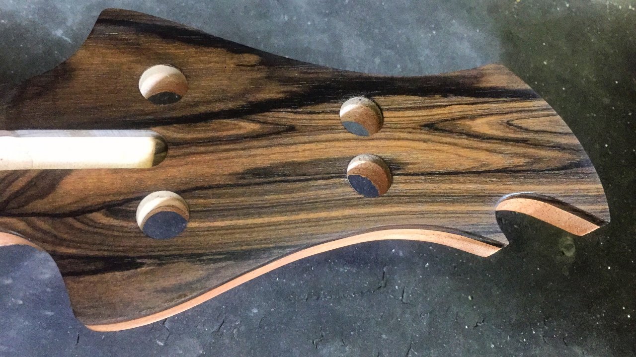 Schau mal ich habe hier mal ein Stück Ebenholz draufgelegt und die Mensur-Linie mit Bleistift aufgetragen. Die Brücke müsste nach hinten 1cm breiter werden, wenn ich die Saiten auch in die Brücke einhänge. Aber du siehst schon das noch Platz ist (und der Volta-Body ist relativ kurz).