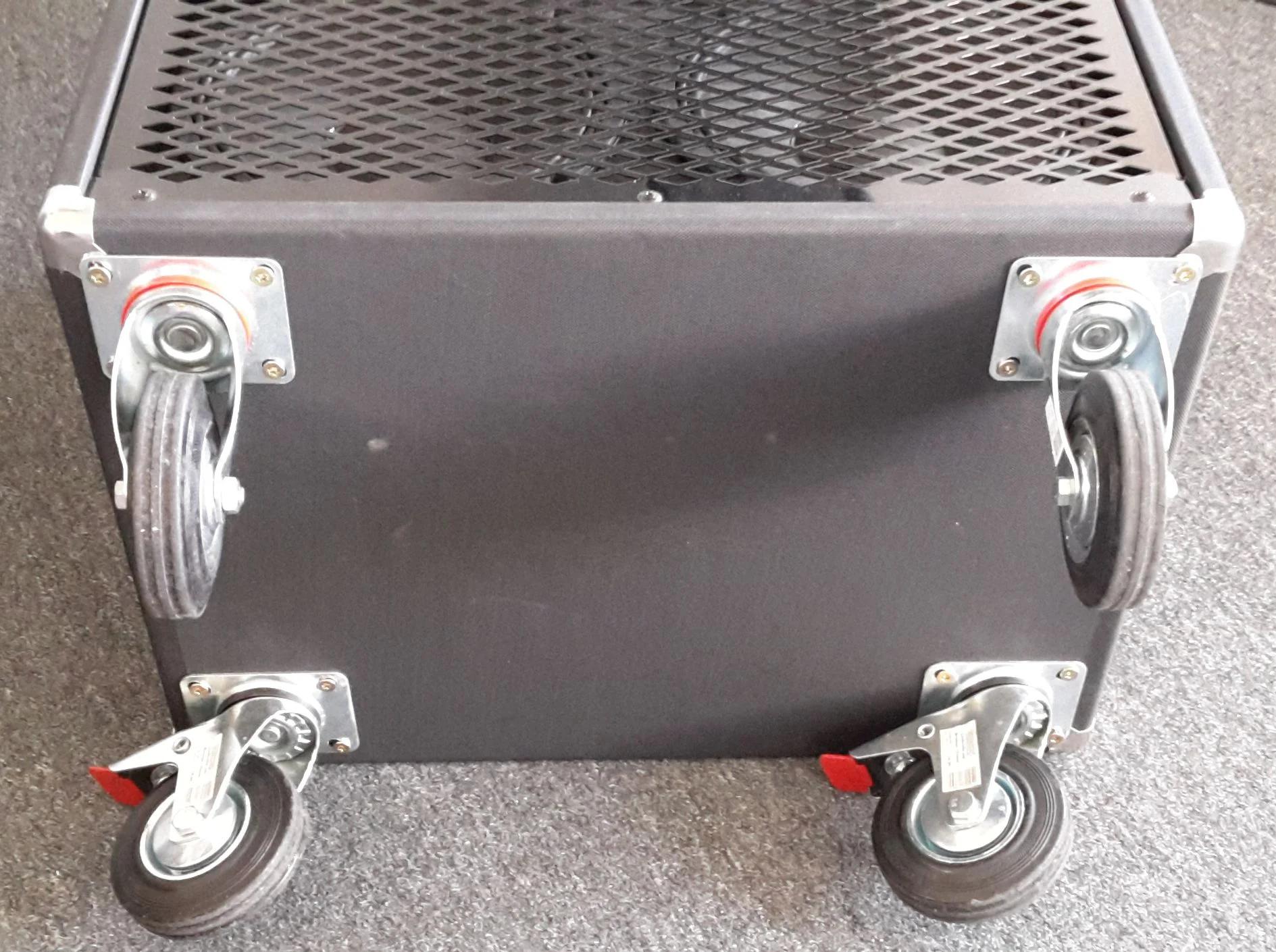Die Box ist sehr gut in Schuss, optisch als auch technisch. Ich habe die Box mit dicken und sehr robusten Rollen versehen, zwei von den Rollen sind mit Bremse ausgestattet.