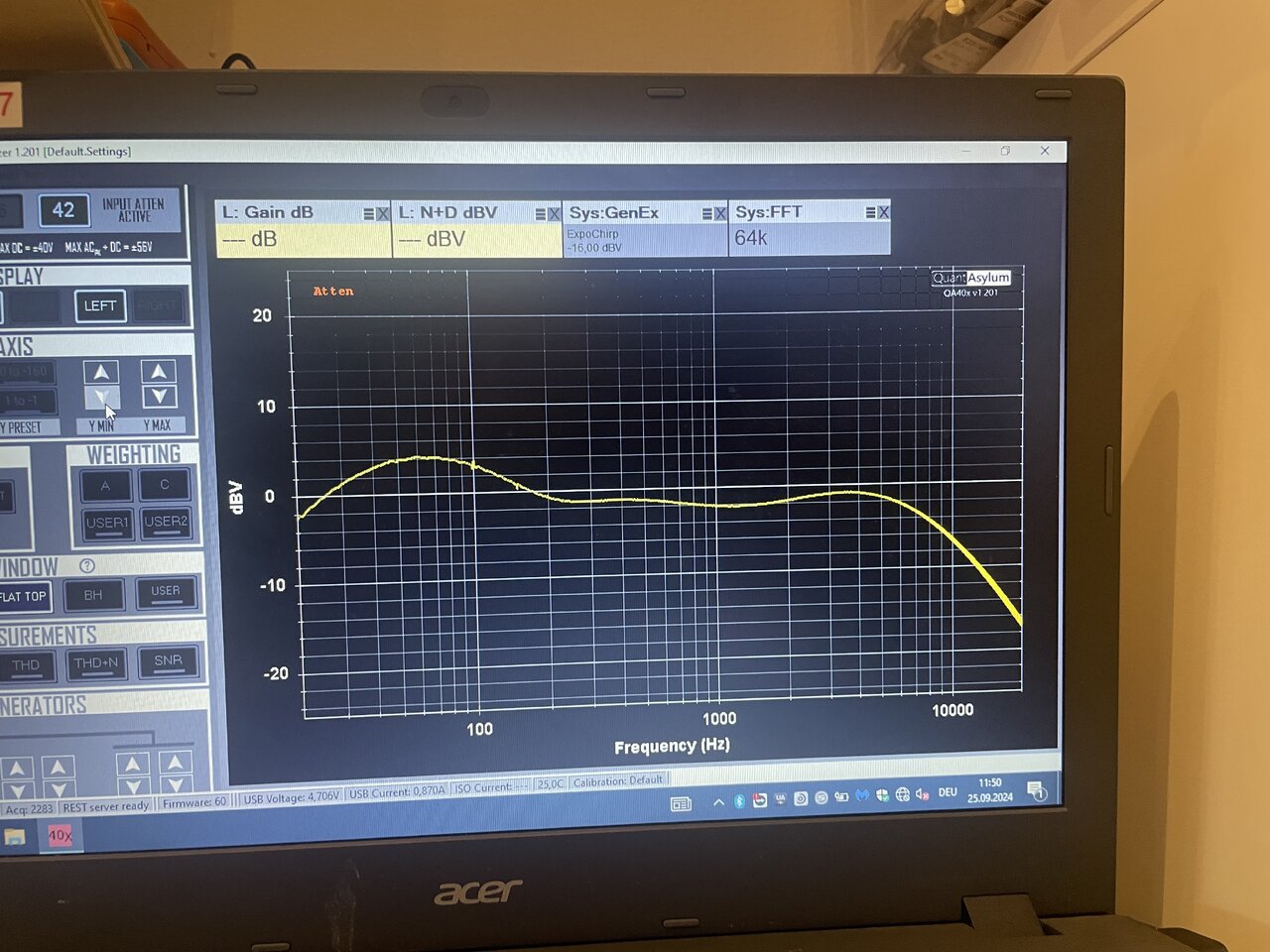 Der hat automatisierte Messungen in der App, kann aber auch nicht mehr als 40V RMS ab. Deshalb werde ich einen symmetrischen Abschwächer -10 und -20 dB in meinen Lastwiderstand einbauen und dann symmetrisch messen. Das sollte für alles reichen.