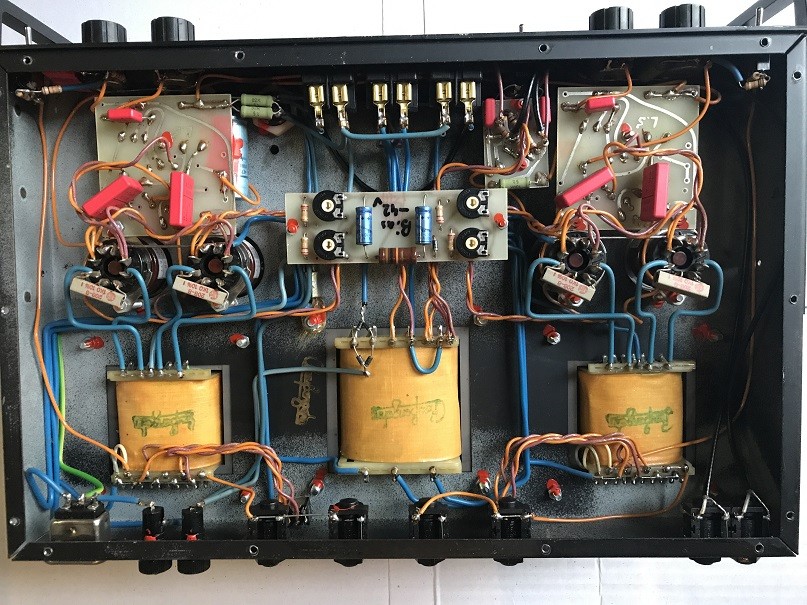 Das Innenleben entpuppt sich als "mittelwertig" > es gibt schöner aufgebaute Amps, Lötarbeit ist O.K.