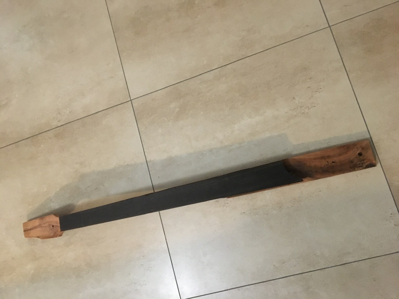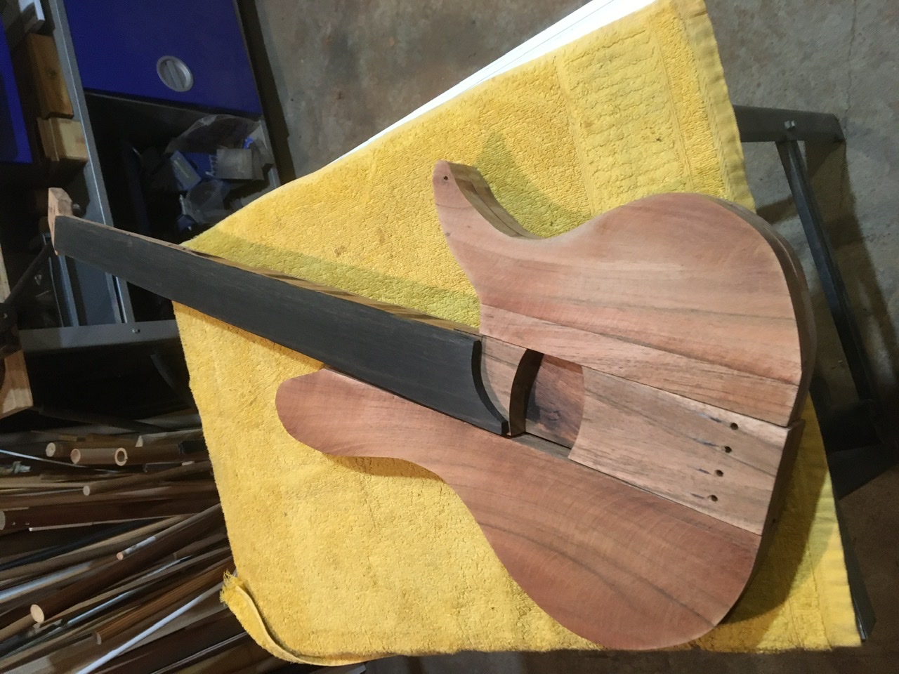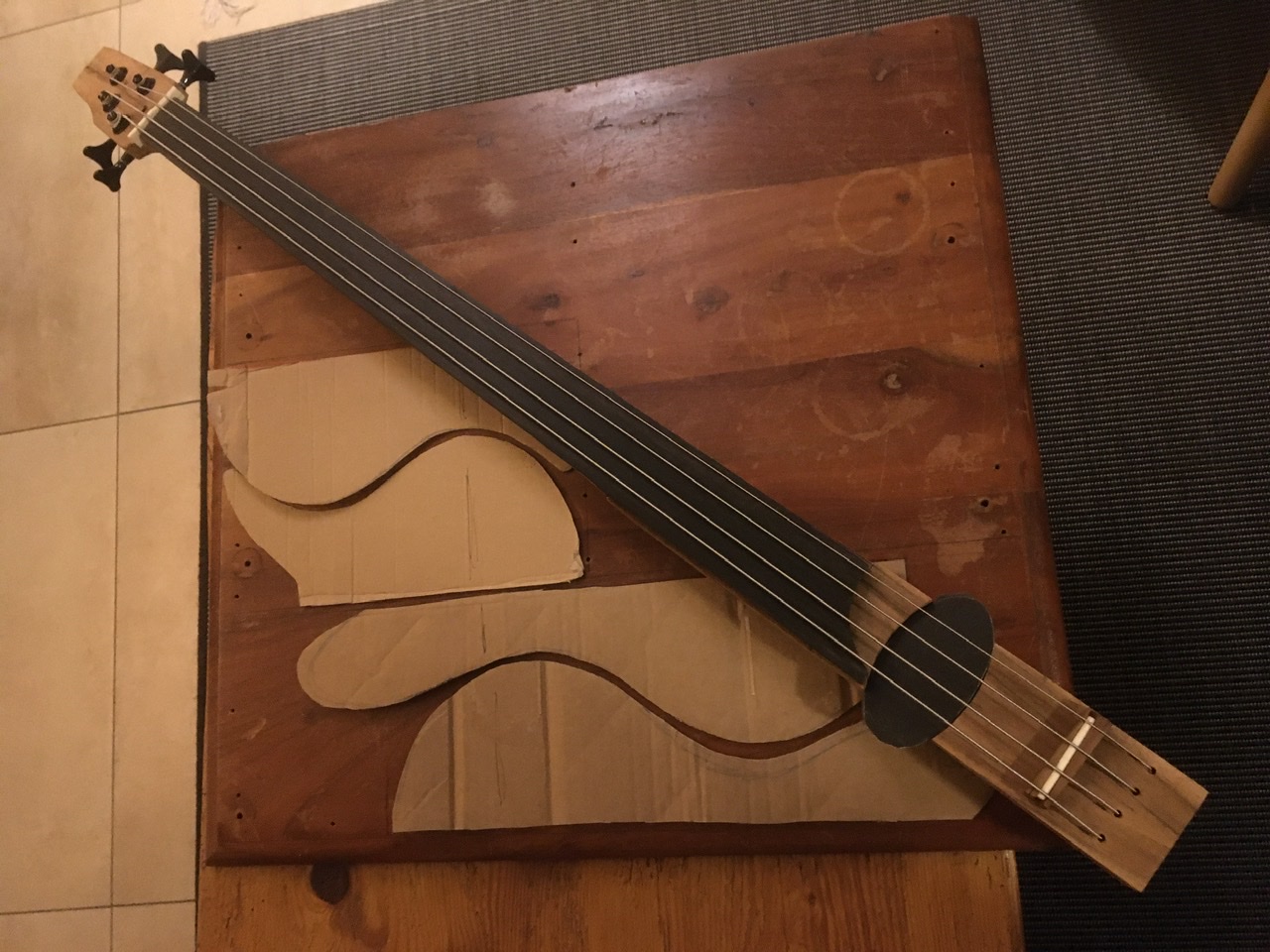 Ja, ich wollte mal wieder einen Bass bauen. Und da stand schon eine Weile dieser ausrangierte Tisch herum. Material: Sheesham bzw. indian rosewood.
