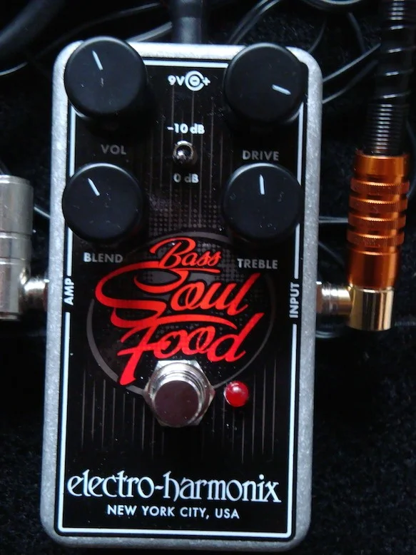 Nun habe ich mich auch zuhause mit dem Teil beschäftigt. Den Bass Soul Food (BSF) direkt zwischen Bass und meinem kleinen Ampeg Micro VR + AV210 geschaltet. Auch hier gefällt er mir. Klingt und reagiert genauso wie im Board über die grosse Anlage. Der BSF ist ziemlich flexibel. Er kann auch als clean Boost genutzt werden. BLEND ganz auf Linksanschlag und schon kann man mit VOLUME den Boost einstellen. Hier haben DRIVE und TREBLE keinen Einfluss. Eine zweite Boost-Variante mit Klangbeeinflussung gibt es auch: BLEND z.B. Auf 15 Uhr und Drive auf Linksanschlag, also ganz raus. nun kann man mit dem TREBlE den Klang beeinflussen.