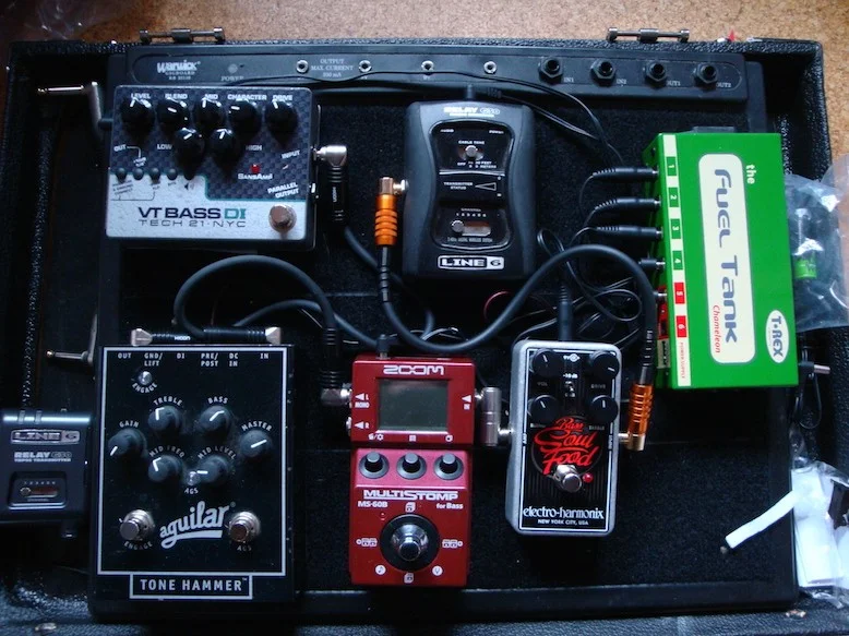 Heute: Ein Grundsound, der auch Slaptauglich sein muss (bei mir Richtung "cleanen SVT-Rocksound" mit der Kombi Tonehammer und VT BassDI + Endstufe über 610 CL Kombi von FMC). Alles andere mache ich mit den Fingern, der Tonblende am Bass und PU-Kombinationen von passiven Fender PJ-Tony Franklin Prezi oder Fender Jazzbass, wobei ich immer den ganzen Gig mit einem Bass durchspiele (je nach Lust und Laune).