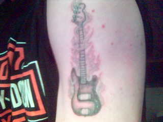 Also wenn ich so auf meinen Arm schaue und mit meinen drei Schätzchen vergleiche, sieht das schon irgendwie genauso aus. Vielleicht liegt`s an der Schwellung, das Foto entstand am gleichen Tag wie das Tattoo selbst.Ehrlich. Nach Fender-Kopfplatte schaut das nie im Leben aus, obwohl es das wahrscheinlich sein soll.