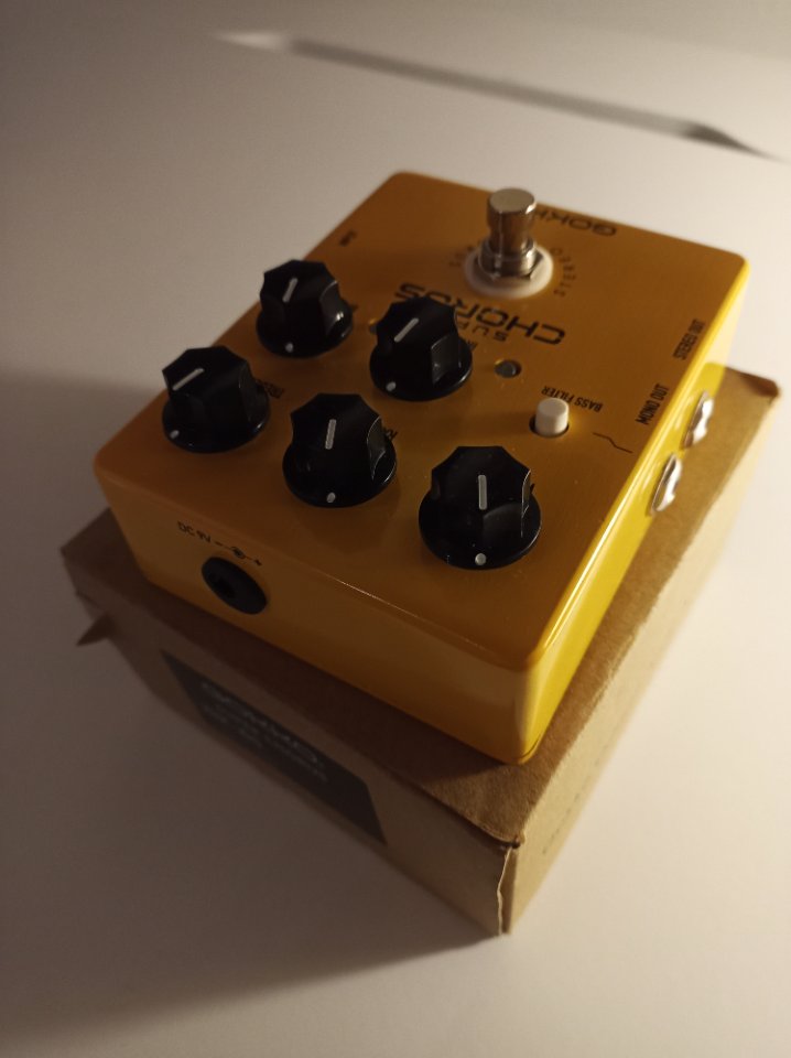 Das Pedal hat eine analoge BBD Schaltung, einen einfachen EQ für den Chorus Anteil sowie eine Taste zur Anpassung an Bässe (eine Bass-Anhebung insgesamt, wenn ich das richtig rausgehört habe)